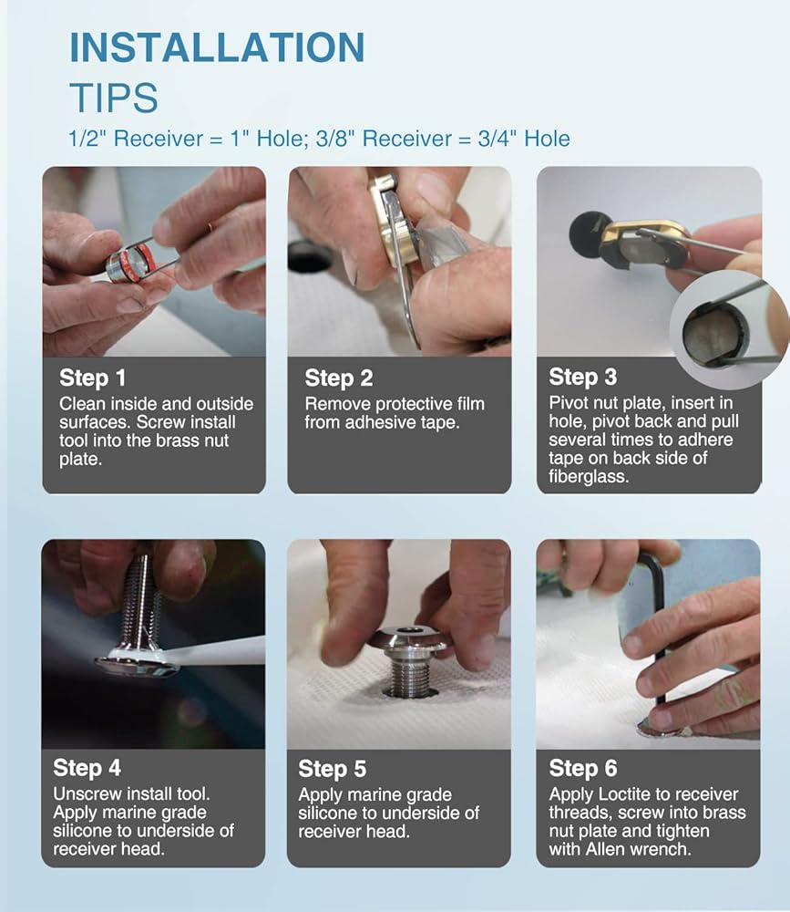【نصائح ودية】 1) قطر الثقب: ⌀ 1/2 بوصة جهاز الاستقبال = ⌀ 1 بوصة؛ ⌀ جهاز استقبال 3/8 بوصة = ⌀ فتحة 3/4 بوصة؛ 2) يوصى باستخدامه على هياكل الألياف الزجاجية. 3) يتم استخدام جهاز الاستقبال 3/8 بوصة مع حامل 3/8 بوصة. 4) للحصول على تجربة تثبيت أفضل، يوصى باستخدام أدوات أخرى لعملية التثبيت. يرجى التحقق من أداة التثبيت الموصى بها والعملية في صفحة تفاصيل المنتج.