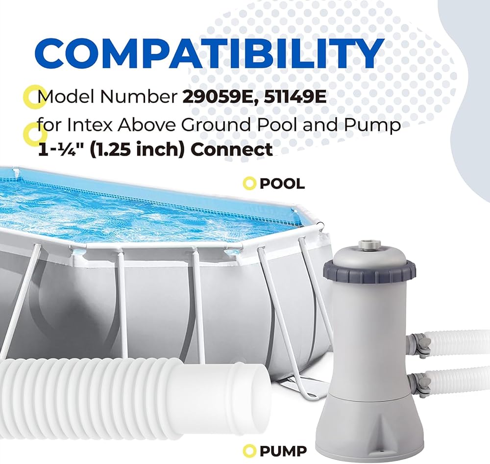 هذا الخرطوم الملحق مقاس 1.25 انش مناسب لمضخات فلتر انتكس وأنظمة المياه المالحة التي تستخدم خراطيم 1.25 انش بما في ذلك المضخات التي يبلغ نطاق جالون في الساعة 530 جالون في الساعة 1000 غالون في الساعة.