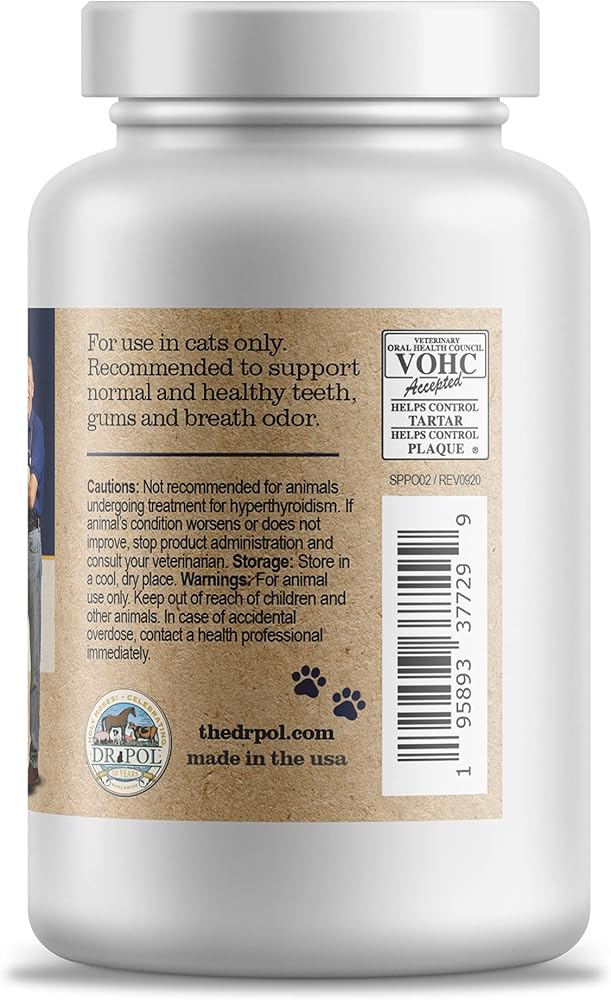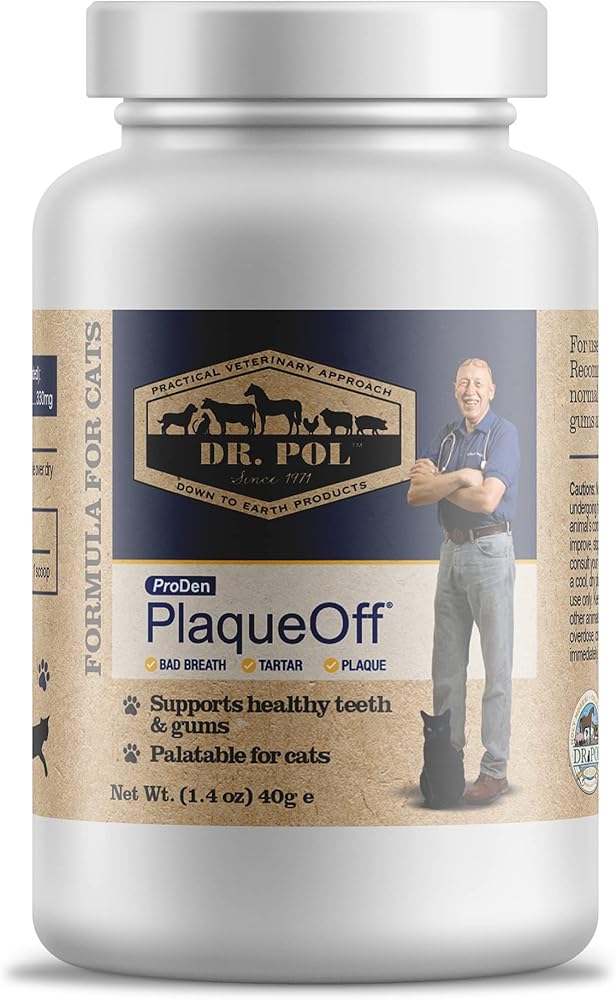 About Dr. Pol ProDen PlaqueOff Powder for Cats Bye bye, stinky cat breath! Dr. Pol ProDen PlaqueOff Powder for Cats is formulated clinically-tested dental care ingredient Ascophyllum nodosum seaweed. This natural supplement works to freshen cat breath by helping reduce plaque and tartar buildup. Plaque Off for cats is backed by two double-blind studies which determined ProDen Plaque Off Powder to be beneficial for pet's daily oral care. Specially formulated for feline friends, ProDen for cats contains brewers yeast for a savory taste that kitties can't get enough of. Highly palatable and highly effective, you can't go wrong with ProDen PlaqueOff Powder for cats! This easy-to-use cat plaque remover powder makes it simple to give your furry friend a daily dose; simply sprinkle this teeth cleaner powder of their food once daily, and you can see its teeth cleaning power over time. The formulation of this proven-effective plaque remover for cats is 100% natural with no gluten, no added sugar, no additives, and no artificial preservatives. Cat oral care doesn't stop at fresher breath; the health of your cat's teeth can affect their overall wellness. That's why it's vital to use preventative cat dental care products with wholesome ingredients. ProDen Plaque Off for cats works internally with natural ingredients to help improve oral health for cats of all ages.