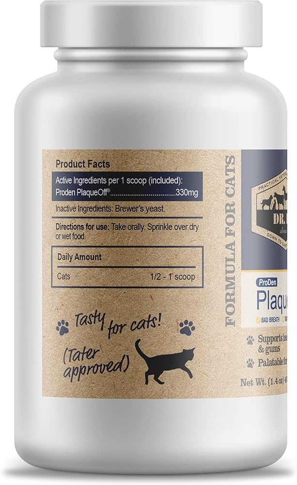 ProDen Plaque Off Powder for Easy Cat Teeth Cleaning: Works from within to help freshen cat breath over time. Oral health for cats is now simple: just sprinkle a measured scoop over cat's food daily.