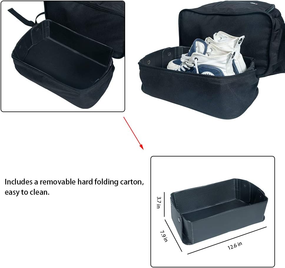 The designed separated shoes compartment with removable folding carton to keep your shoes and dirty gear separate with clean stuff,which can fit a pair of Size 8.0 US Men or 9.5 US Women running shoes,or something wash supplies. if you feel heavy with the folding carton ,you can just remove it.