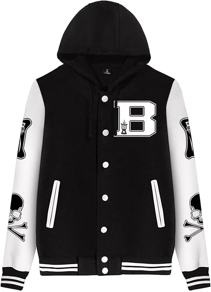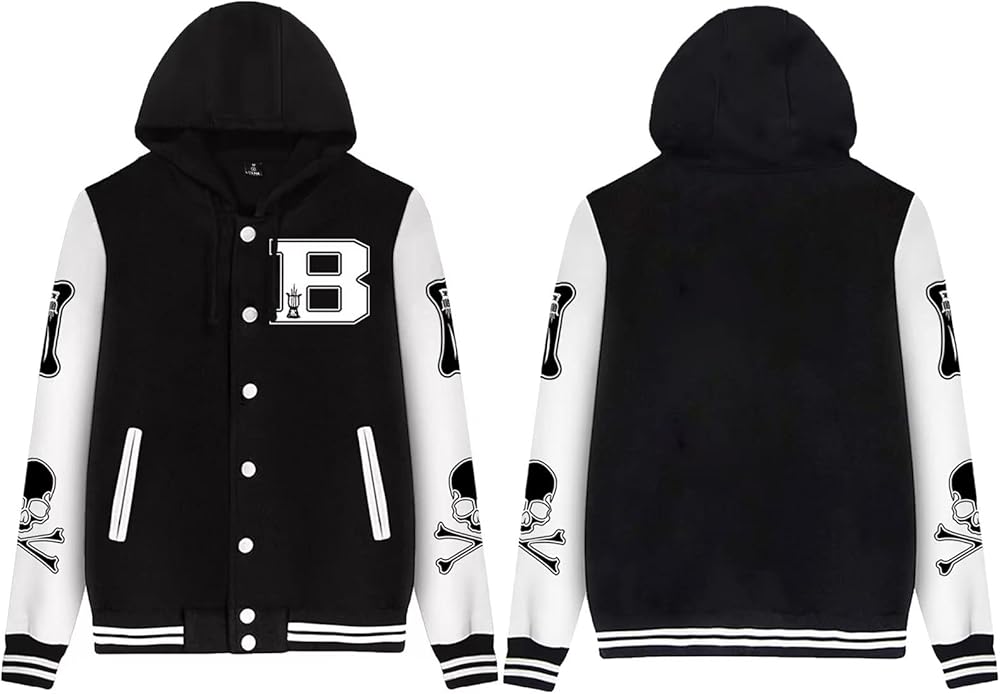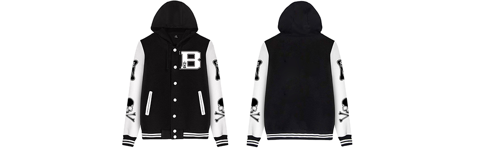 السمات: سترة جامعية كلاسيكية بأحرف وعظام، إغلاق سريع، أكمام طويلة متباينة، تصميم برباط بغطاء للرأس، جيبان أماميان.