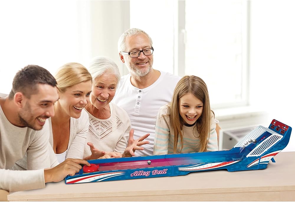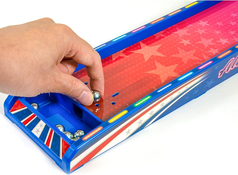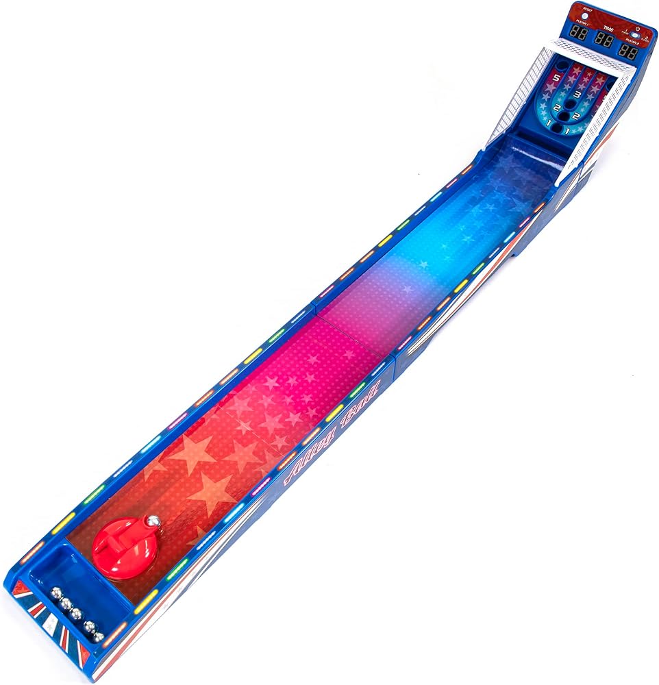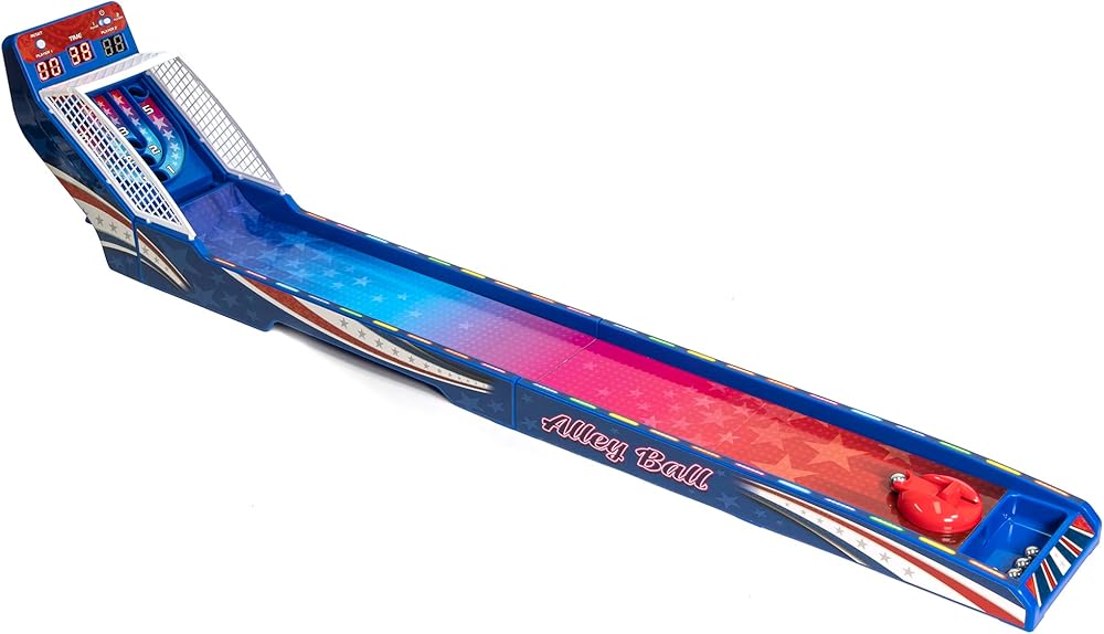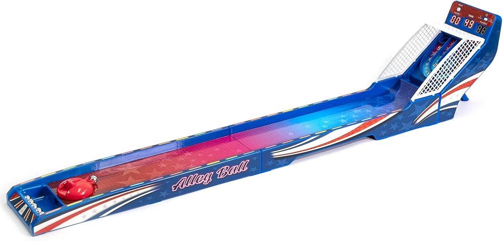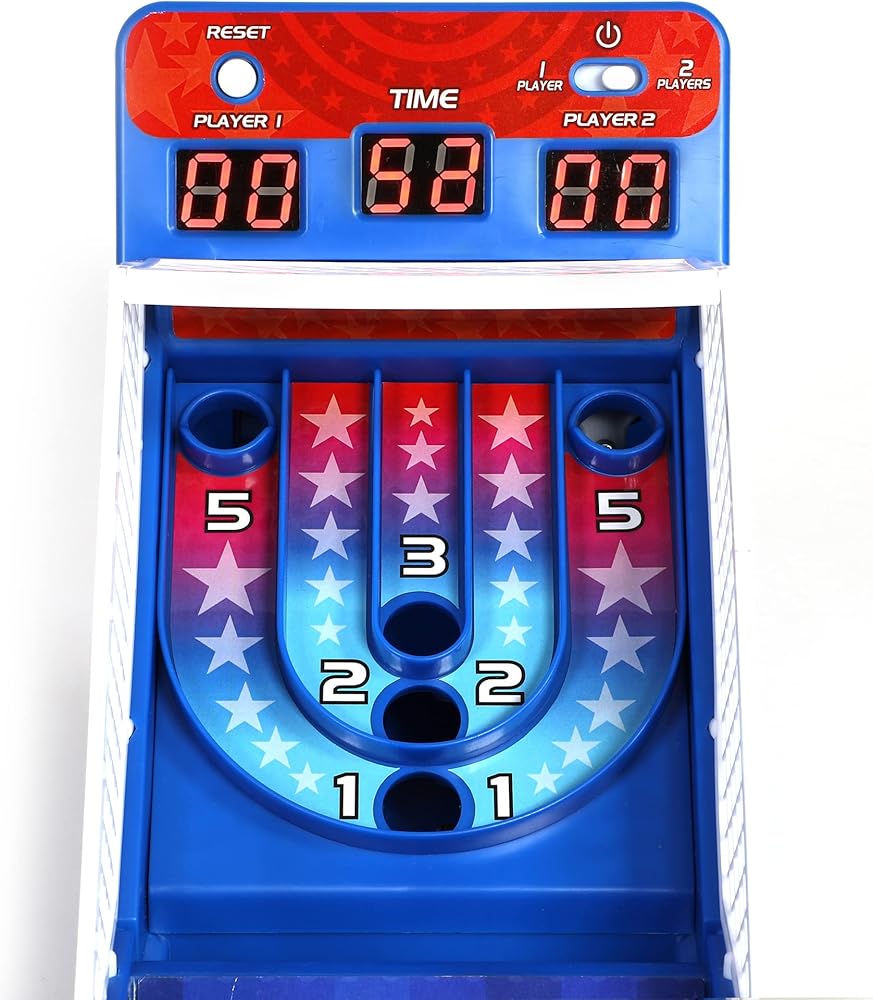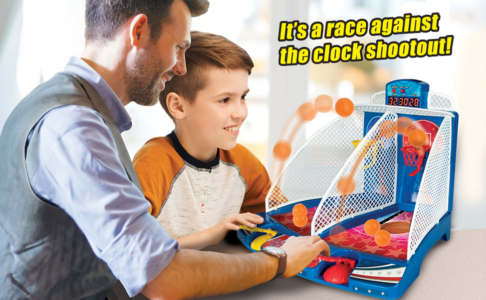 It's a 2 player race against the clock shootout! Bring the thrills & excitement of the arcade home with Retro Arcade Electronic Basketball. Just like at the arcade shoot as many balls as you can at the basket to run up the score and take the lead. The large LED scoreboard includes a 60-second countdown timer, as well as HOME and GUEST scores. Each basket is worth 2 points, but for the final 15 seconds it increases to 3 points as the alarm sounds. The stadium sound effects turn up the excitement as points are scored and the seconds run down, while the countdown timer cranks up the tension. The smooth spring-powered basketball launcher allows for rapid shooting action. Setup is quick & easy: turn it on, press the button, and it's time to play! For 1-2 players. Requires 3-AAA batteries (not included). Recommended for ages 6 and over.