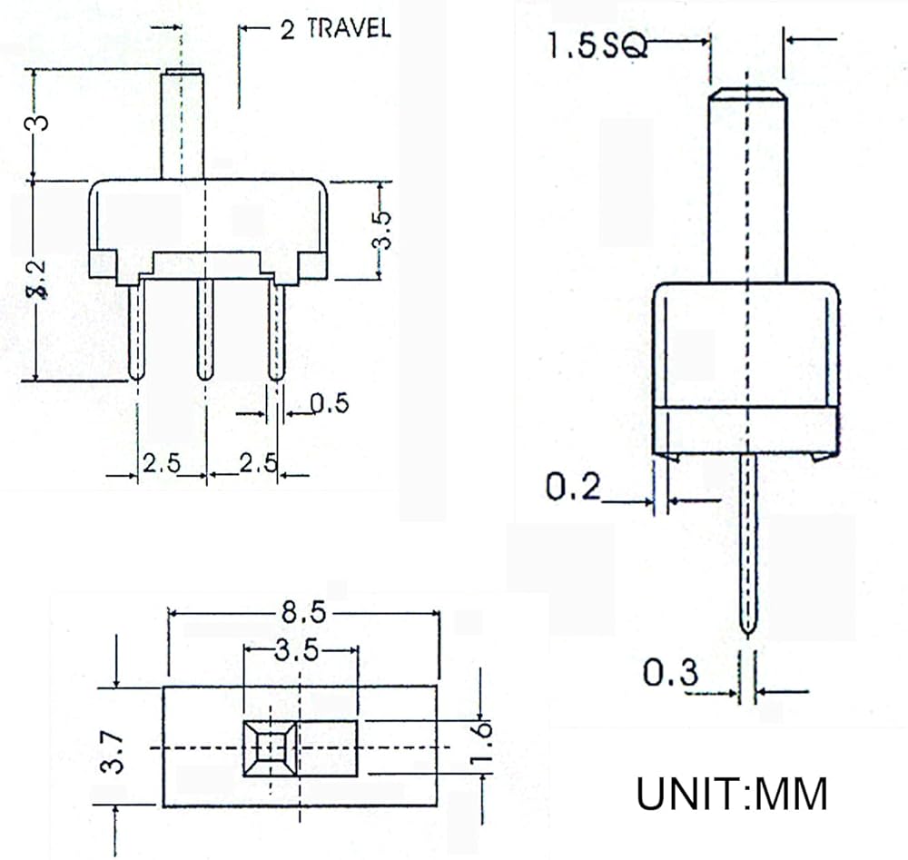 【المقاس】حجم مفتاح منزلق SPDT: 8.5*3.7*11.2(مم)؛ طول الدبوس: 4.7 ملم؛ طول المقبض: 3 مم؛ تباعد الدبوس: 2.5 ملم