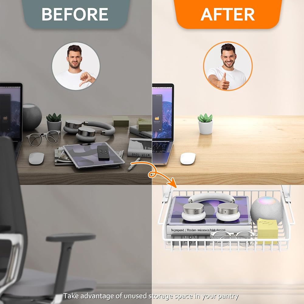 【انزلاق سلس للداخل والخارج】 سلة درج تحت المكتب يتم سحبها للداخل والخارج دون عناء لسهولة الوصول إليها، كما أن "الإيقاف" المتضمن يمنع الدرج من السحب عن طريق الخطأ بعيدًا، كما تمنع الشفة المرتفعة في الخلف العناصر من السقوط.
