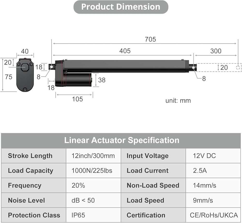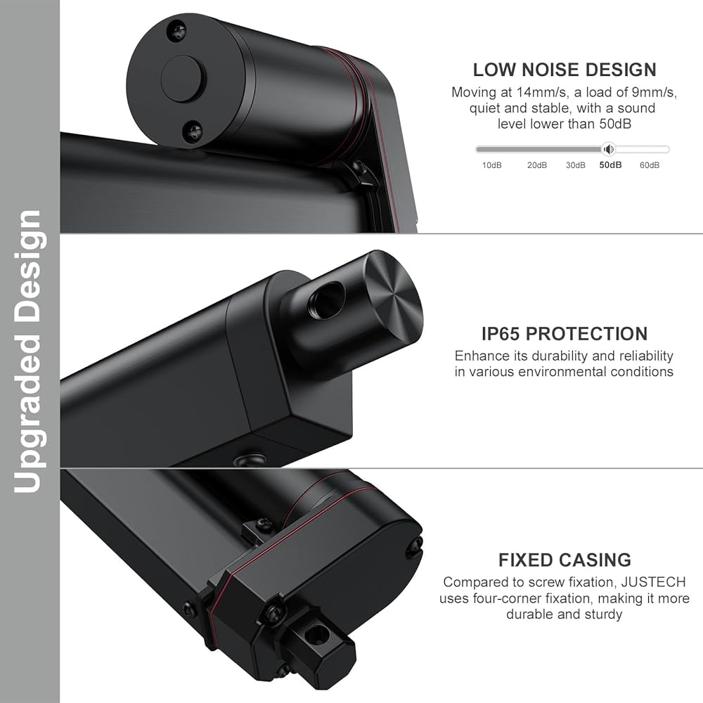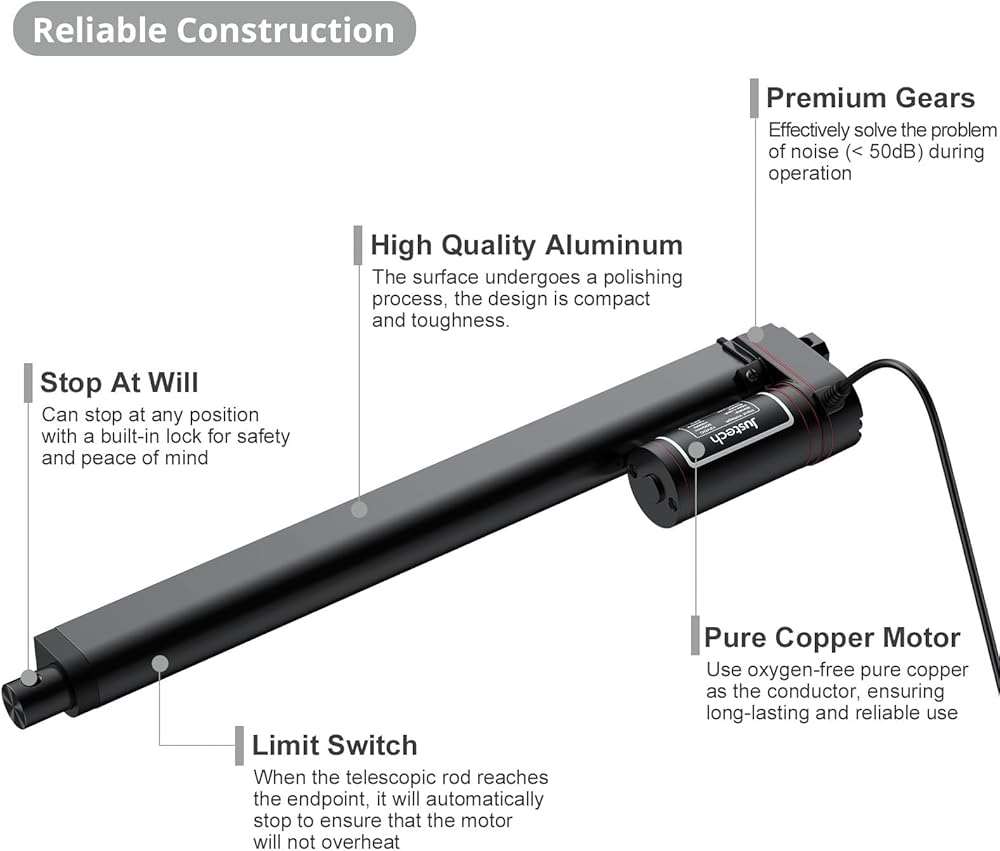 【مشغل بناء عالي الجودة】المحرك الخطي الخاص بنا مصنوع من الألومنيوم عالي الجودة، مما يضمن المتانة والموثوقية. شديد التحمل 1000N/ 225LBS، يتميز بمحرك عالي الأداء ومفاتيح حد مدمجة، مما يسمح له بالتوقف عند أي موضع والتوقف تلقائيًا في الأعلى. بفضل وظيفة القفل الذاتي، يمكنك الوثوق بأنه سيحتفظ بوضعه بشكل آمن