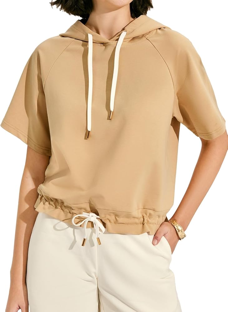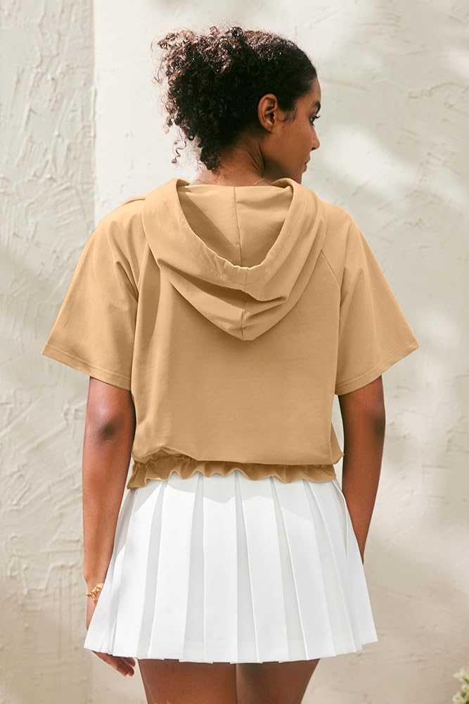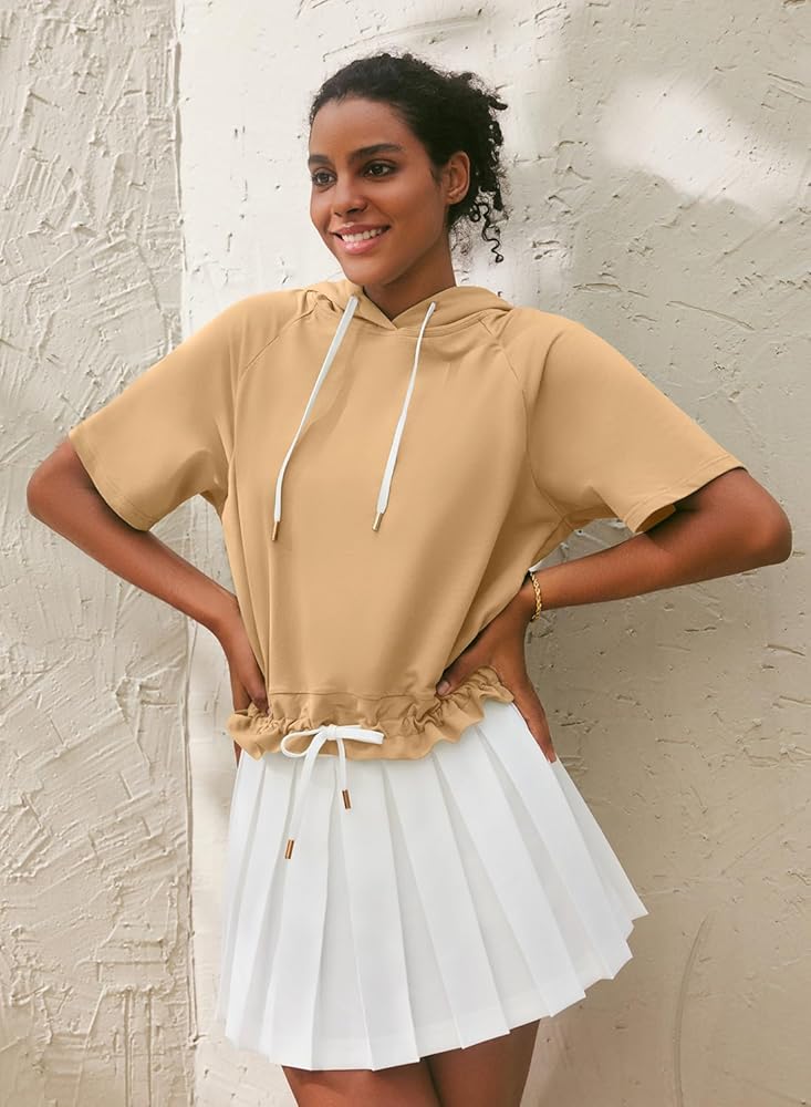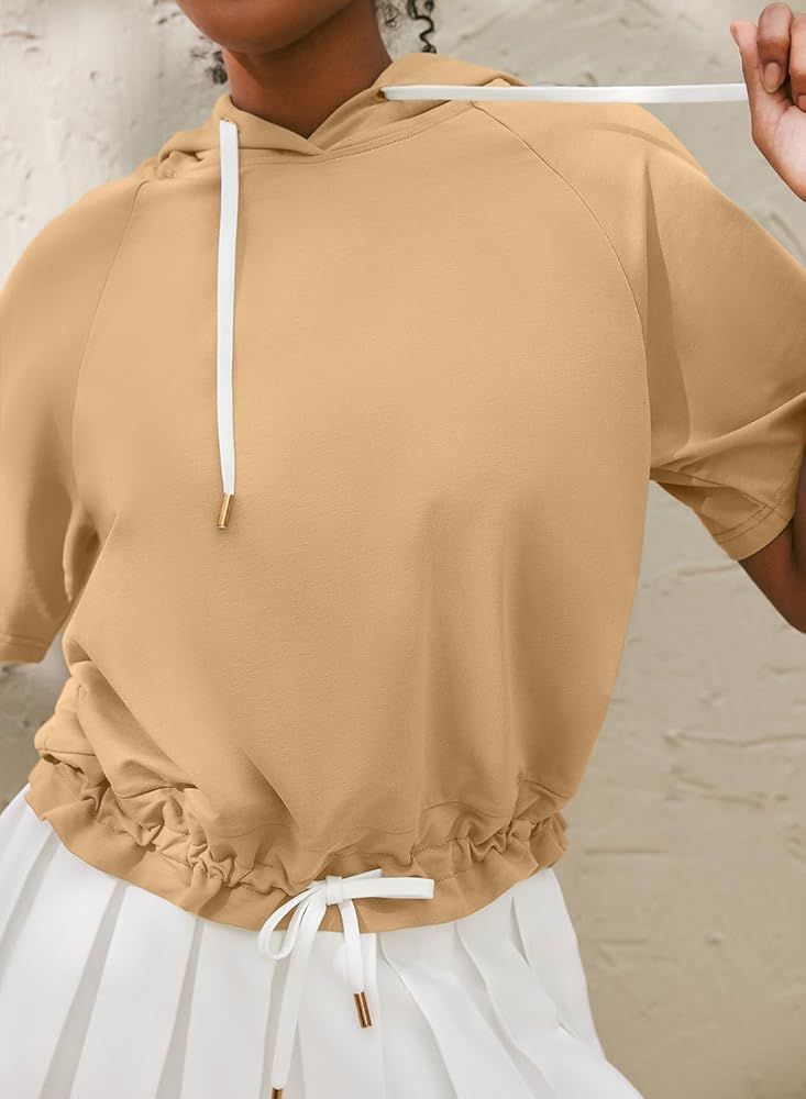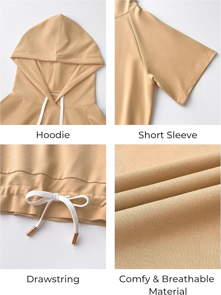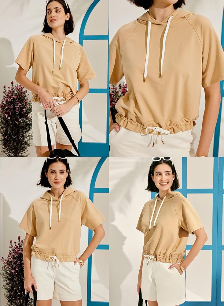 السمات: قمصان صيفية نسائية بلون موحد مع غطاء للرأس، حاشية مرنة، تصميم رقبة على شكل حرف V، رباط قابل للتعديل، أكمام قصيرة، لون ثابت، مقاس فضفاض، قمصان كاجوال بقلنسوة.
