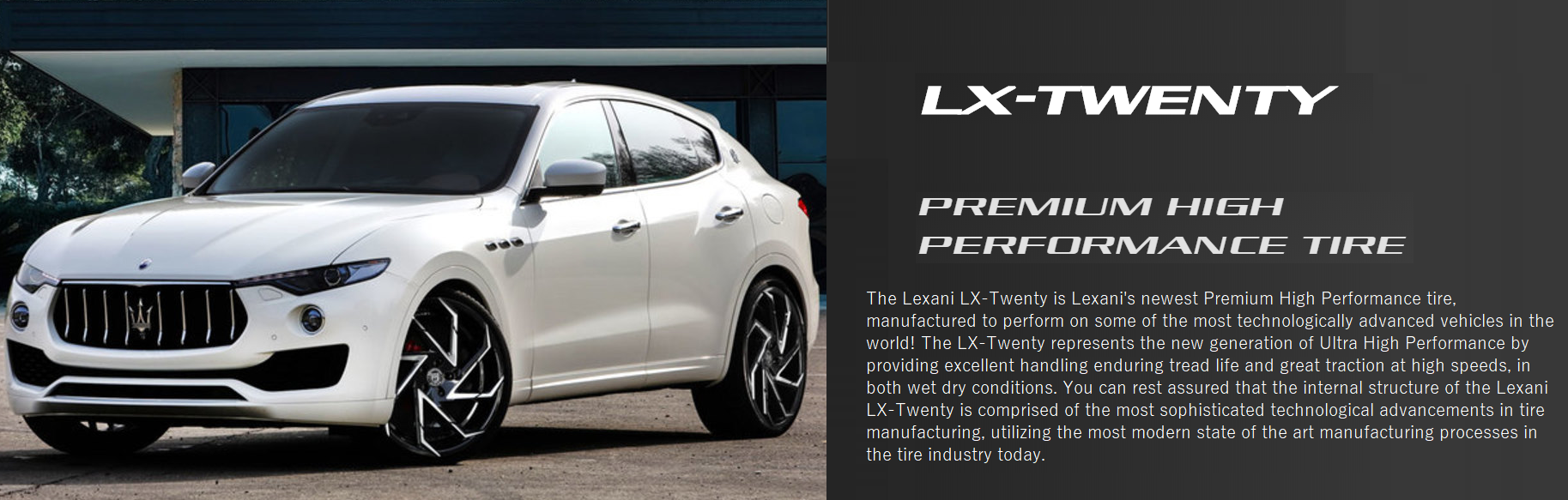 Lexani LX-Twenty is Lexani's newest Premium high performance tire, manufactured to perform on some of the most technologically advanced vehicles in the world! The Lexani LX-Twenty represents a new generation of Ultra High Performance Tires by providing excellent handling, long tread-life and great traction at high speeds, in both wet and dry conditions.