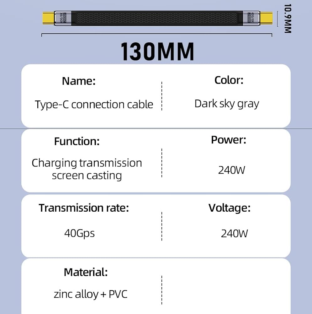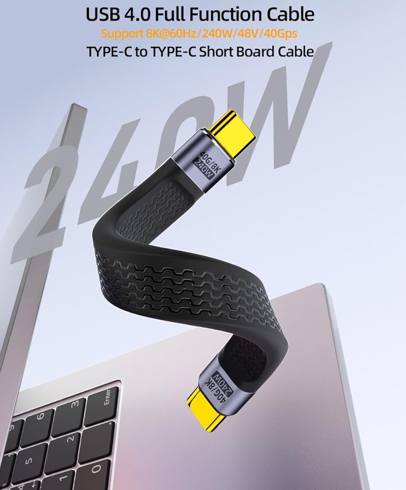 كابل USB C Thunderbolt قصير 240 وات FPC كابل USB C قصير 0.4FT متوافق مع Thunderbolt 4، USB 4.0، PD 240W، 8k@60hz، 40gbps كابل USB C قصير يمكن أن يشحن، نقل، موسع لبنك الطاقة، أجهزة الكمبيوتر المحمولة (فضي)
