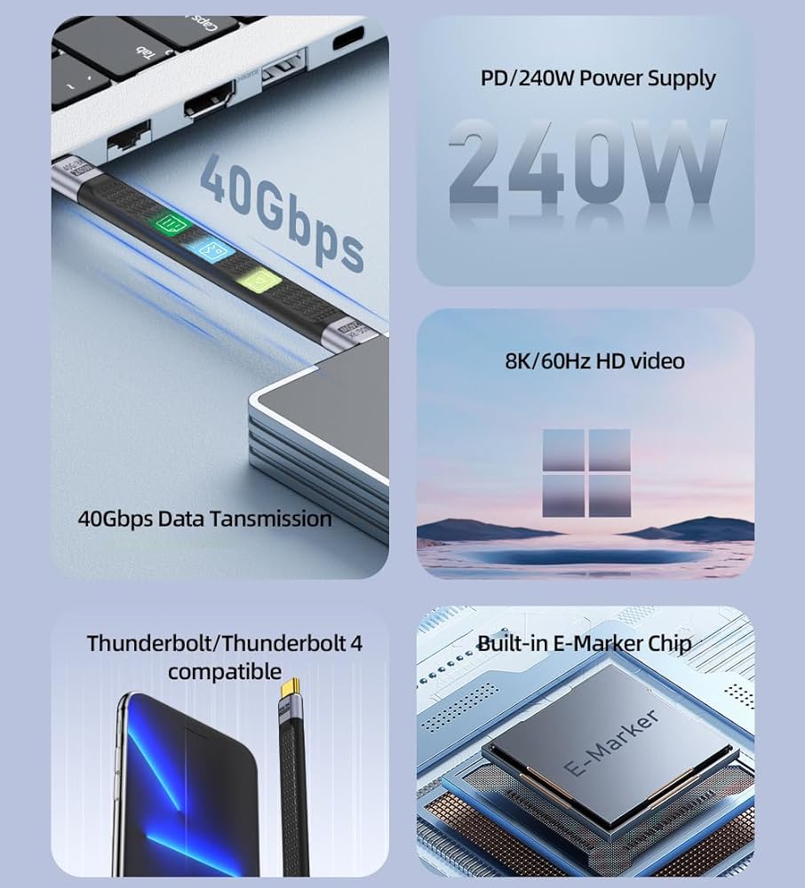 كابل Thunderbolt 4 قصير USB C: كابل SIKAI CASE بطول 0.42 قدم مناسب تمامًا لجميع أجهزة Thunderbolt 4 وThunderbolt 3 وUSB-C وUSB4. يدعم سرعات نقل البيانات تصل إلى 40 جيجابايت/ثانية ويمكنه بالفعل توفير ما يصل إلى 240 واط من الطاقة. يفي بمعيار PD3.1 ومتوافق مع الإصدارات السابقة مع PD3.0/2.0.