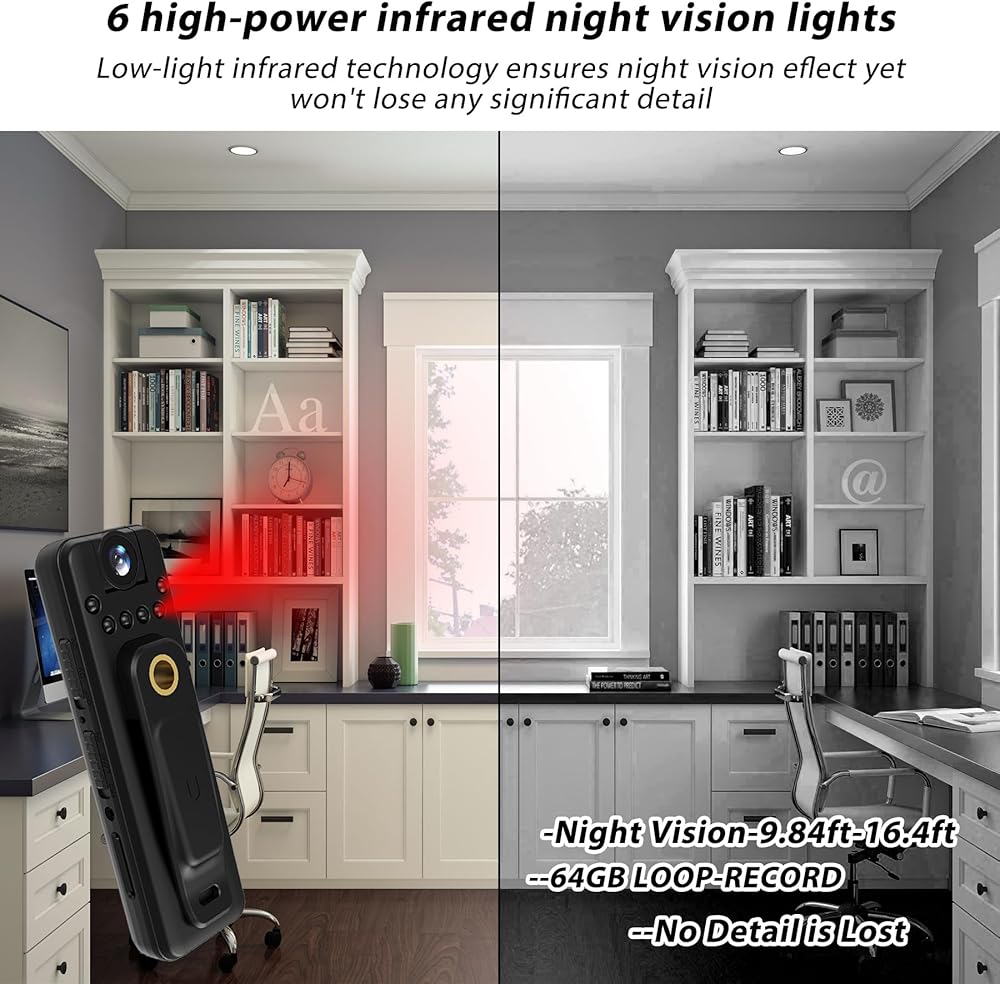 كاميرا Muayb Mini Body 64 جيجابايت مع الصوت والفيديو، عدسة دوارة 180 درجة، رؤية ليلية، تسجيل حلقي، مشبك خلفي يمكن ارتداؤه لركوب الدراجات، إنفاذ القانون، الأمن، السفر (أساسي)