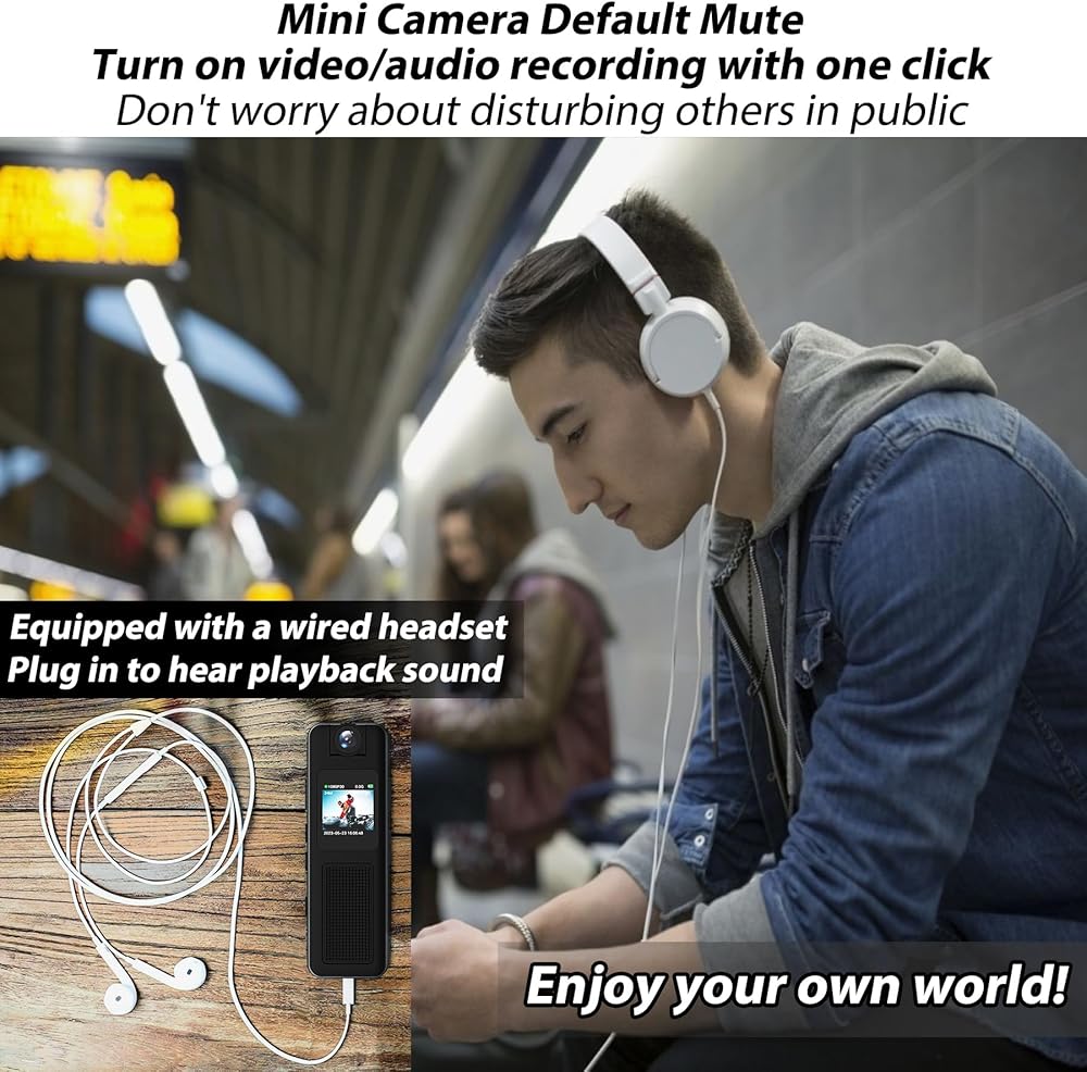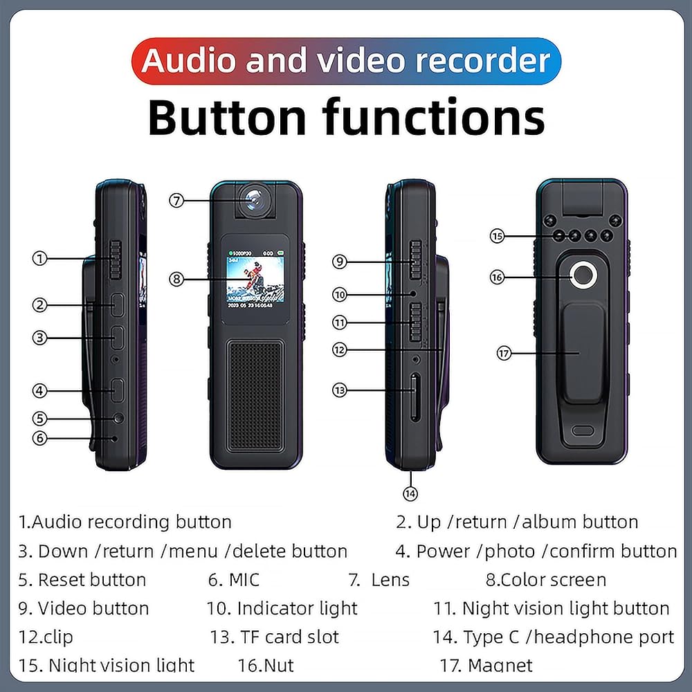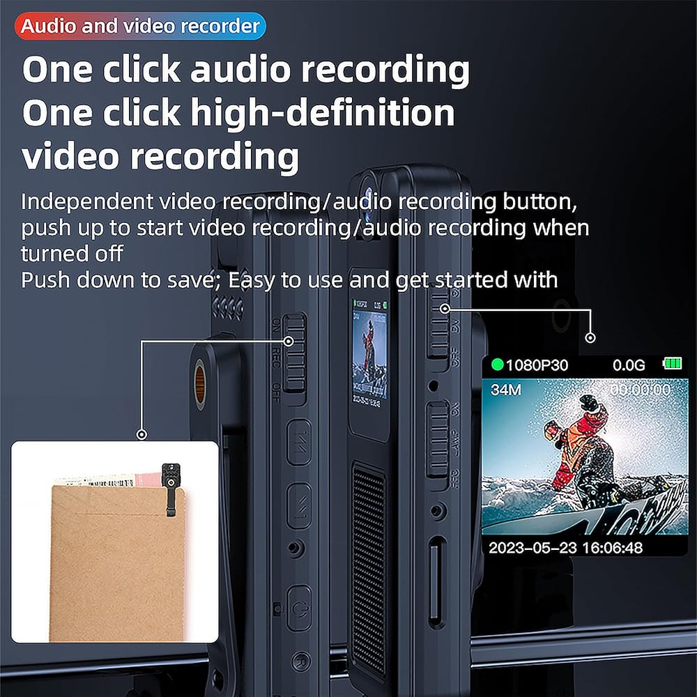 [شاشة 0.85 بوصة وقائمة مفصلة] --- تسجيل صوتي بنقرة واحدة تسجيل فيديو عالي الوضوح بنقرة واحدة: زر تسجيل فيديو/تسجيل صوتي مستقل. سهل الاستخدام والبدء به. مع شاشة مقاس 0.85 بوصة، يمكنها المشاهدة والتسجيل في نفس الوقت. ملائم لإعادة تشغيل لقطاتك وحذفها على الفور. قدمت قائمة مفصلة لتتمكن من استخدامها. تقدم وضع تبديل الشاشة المقلوبة وعرض الطاقة، وتسجيل حلقة بحد أقصى 30 دقيقة. يدعم التسجيل المتكرر ما يصل إلى 256 جيجابايت.
