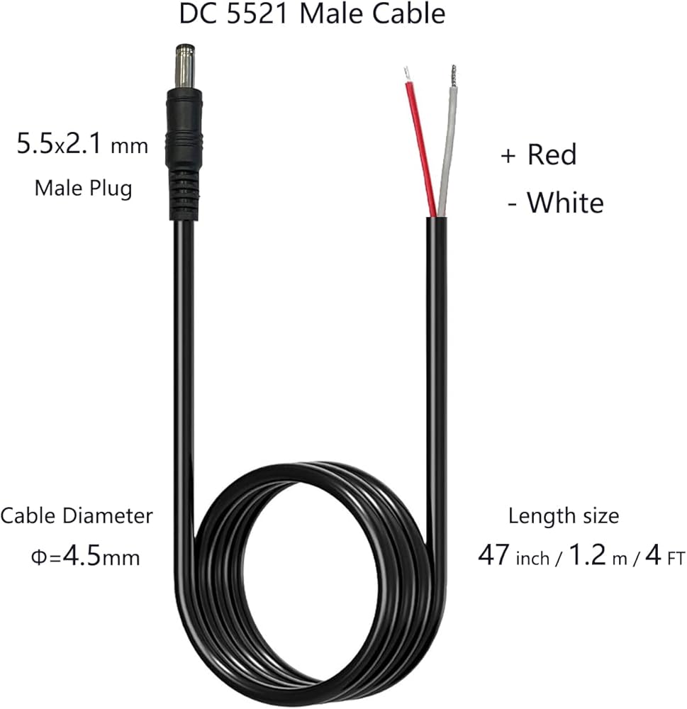 4 FT Design: DC 5.5mm x 2.1mm male plug 4ft/1.2m/47inch length design, compare with other 3ft our 4 ft long enough for your using.