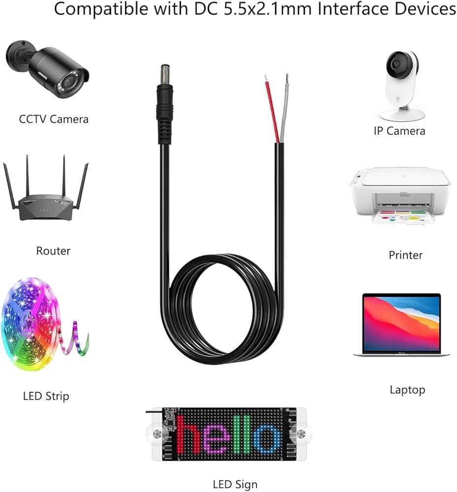 Compatible with: DC 5.5mm x 2.1mm male plug power pigtail wire, compatible with replacement dc 5521 power wire for worn out or broken, such as 12V and 24V DC power supply equipment,wireless IP camera,CCTV security camera, router, printer, Led strip more DC 5521 equipment products.