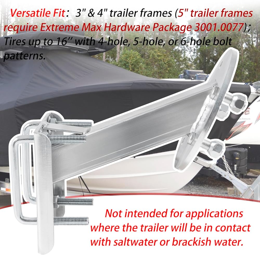 Application: 3001.0064 high mount spare tire carrier is compatible with 3" and 4" trailer frames with included hardware (5" trailer frames require Extreme Max Hardware Package 3001.0077). Also compatible with tires up to 16'' with 4-hole, 5-hole, or 6-hole bolt patterns.