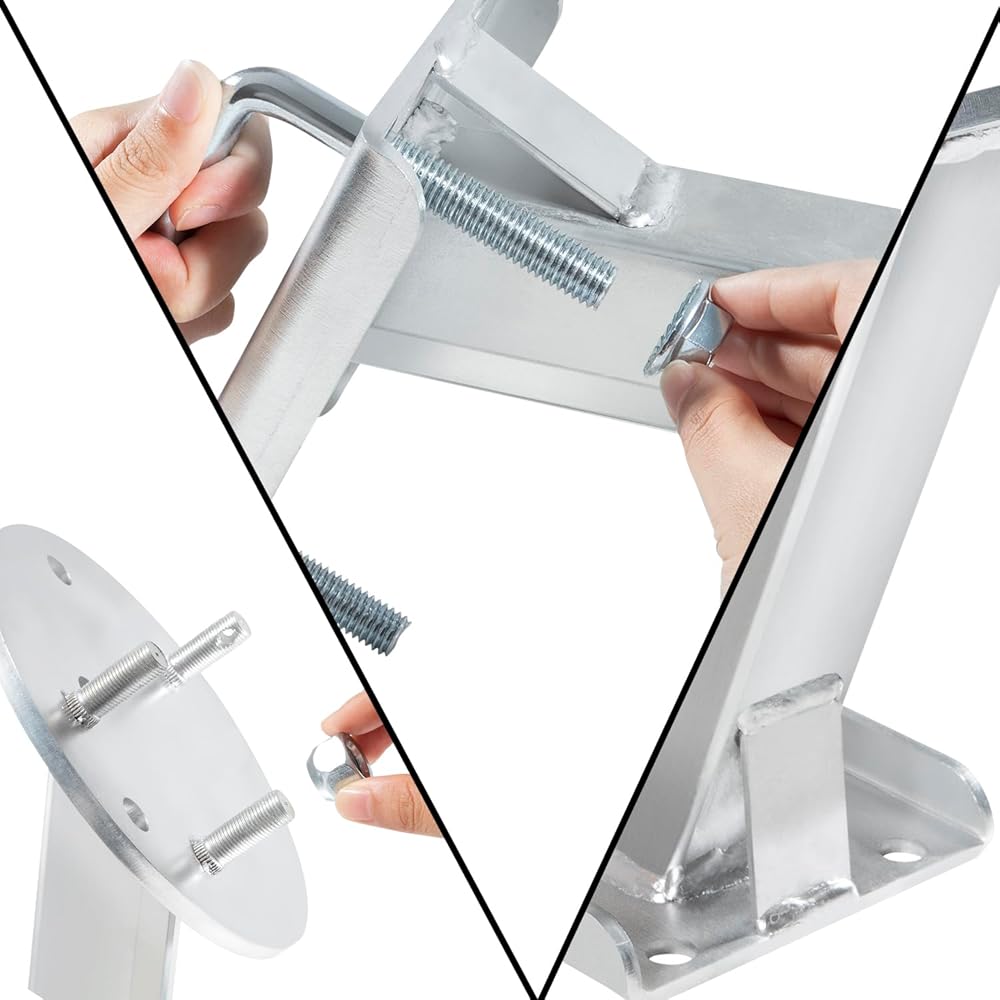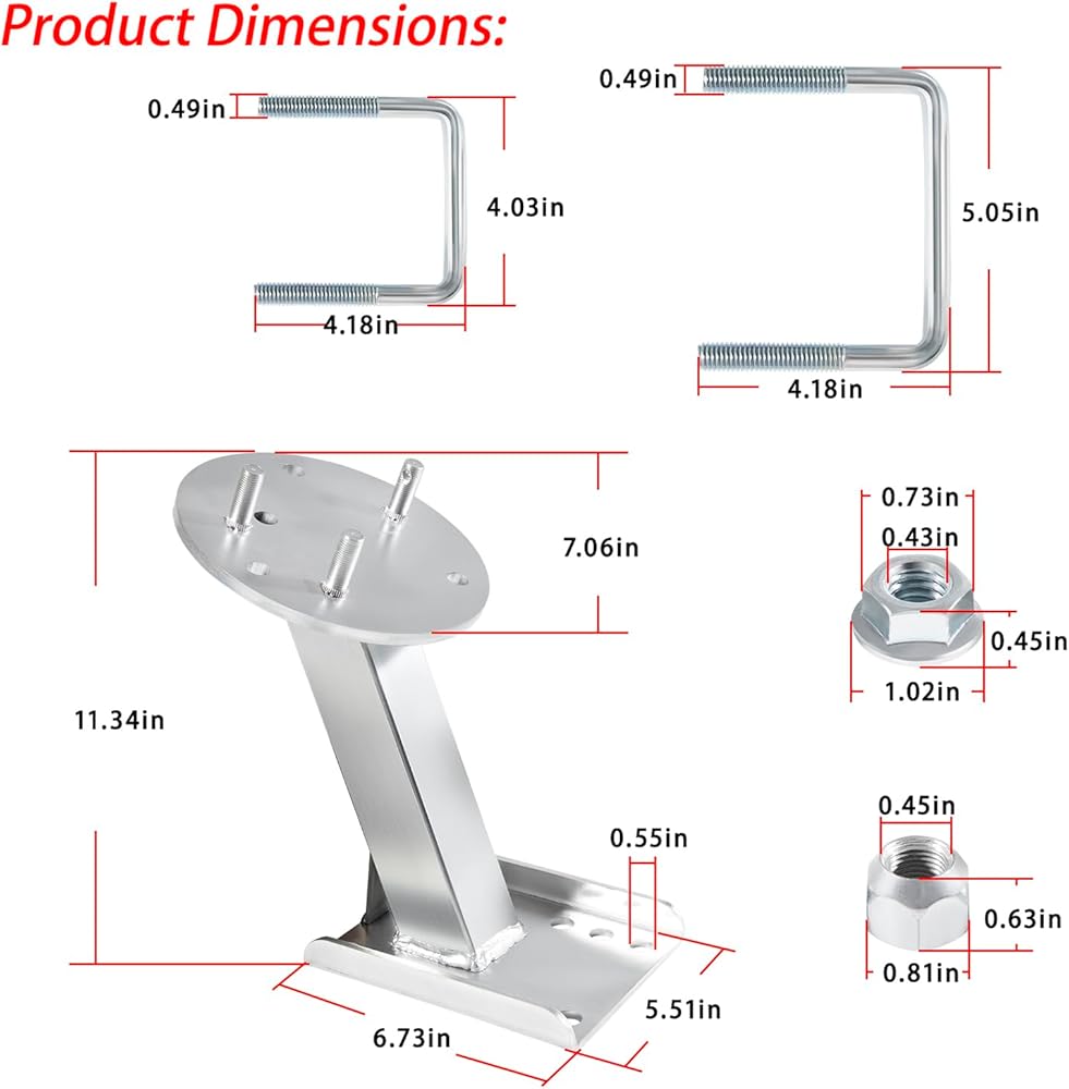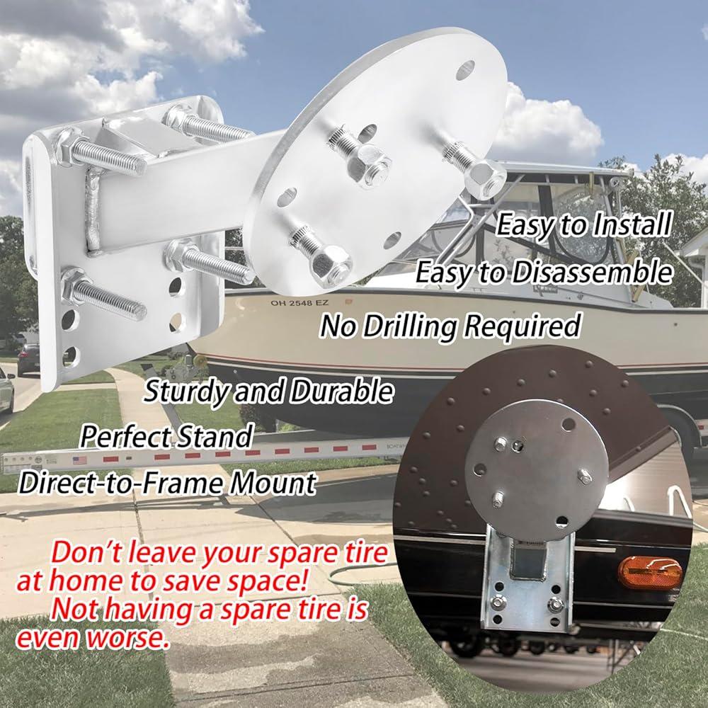 Structure Design:The high mount offset design keeps the tires at an angle and is compatible with all boat trailers.3001.0064 The high mount spare tire carrier is made of high quality steel, which is sturdy and durable. The nickel-plated surface treatment gives it excellent corrosion resistance and relatively high hardness to prevent damage.