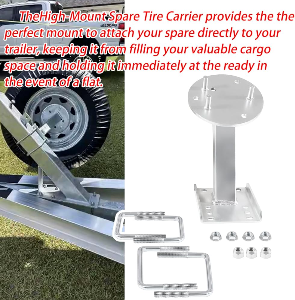 Advantages:The Perfect High Mount Spare Tire Carrier mounts directly to your trailer, keeping it from filling your valuable cargo space and holding it immediately at the ready in the event of a flat. It provides an easy-access mount for nearly any 5 or 6-hole spare tire up to 16" and allows your to get back on the road with minimal hassle.