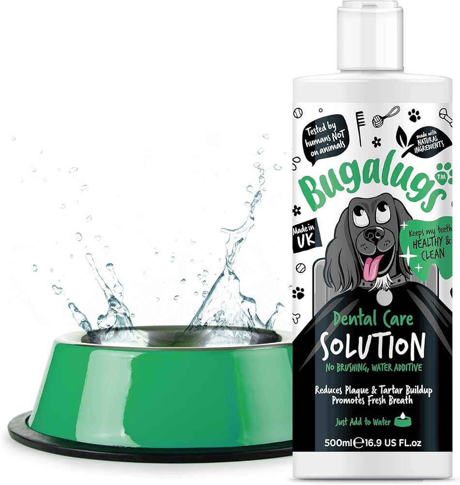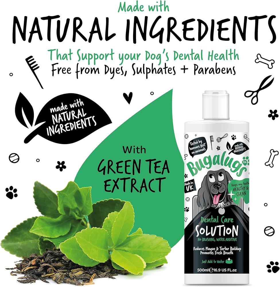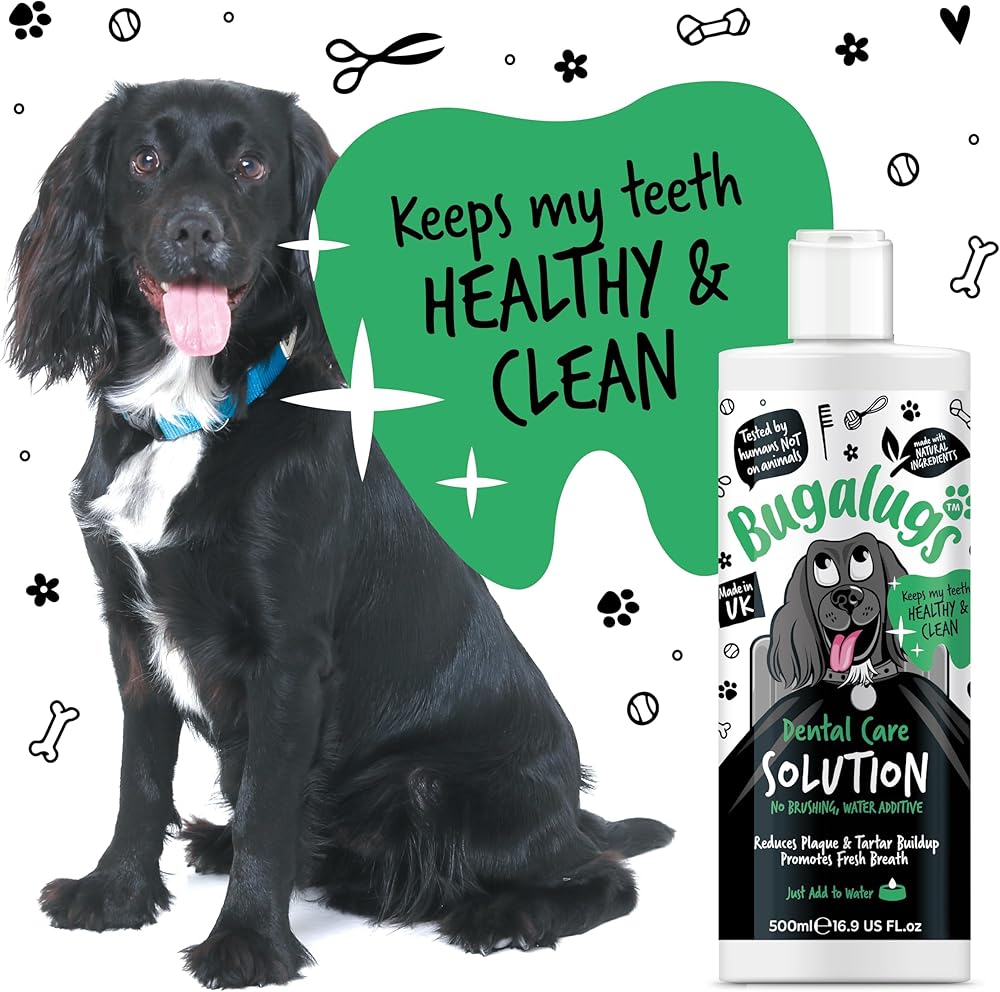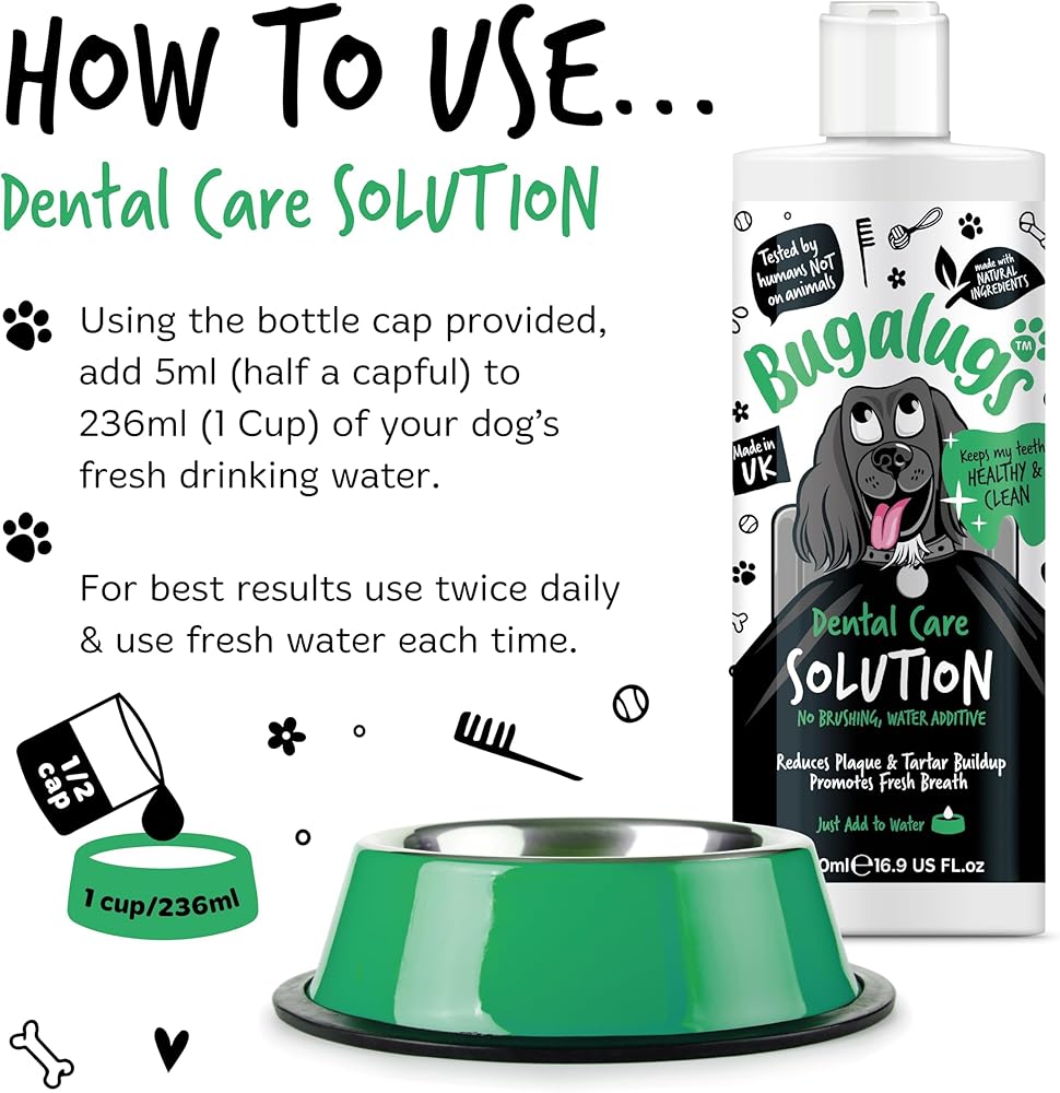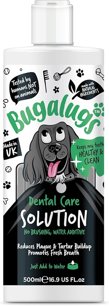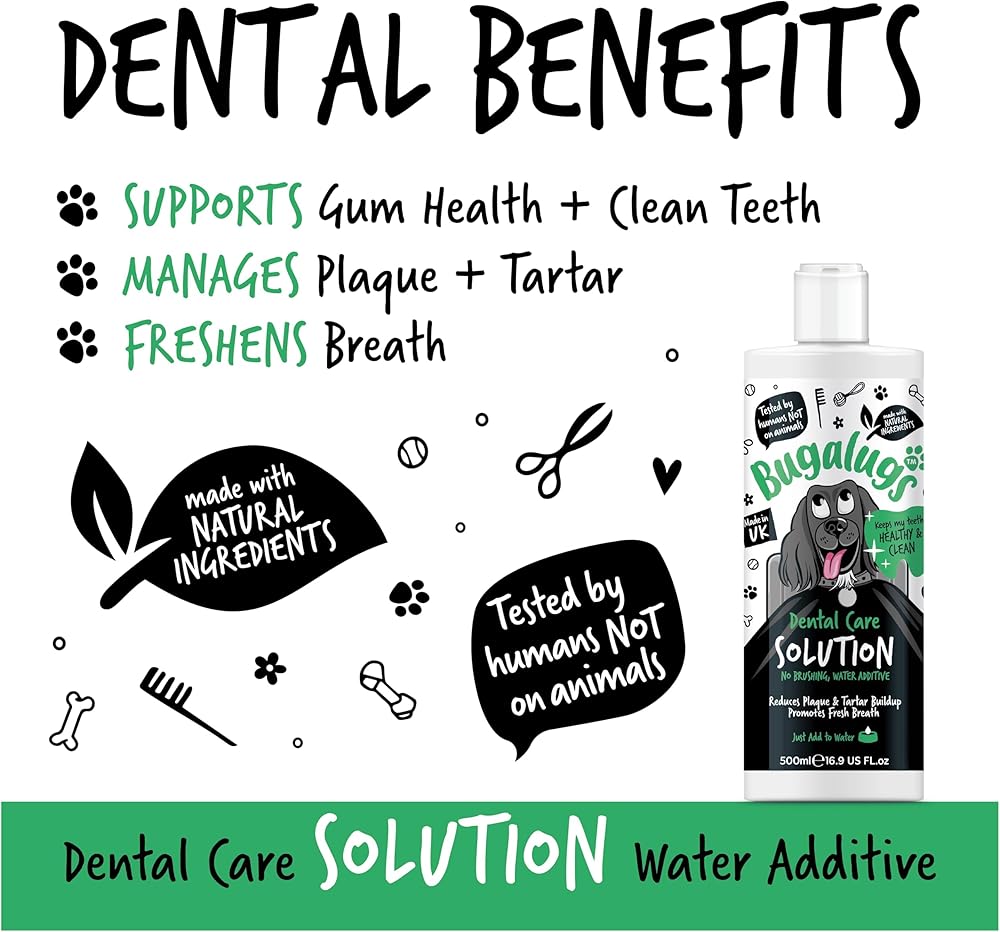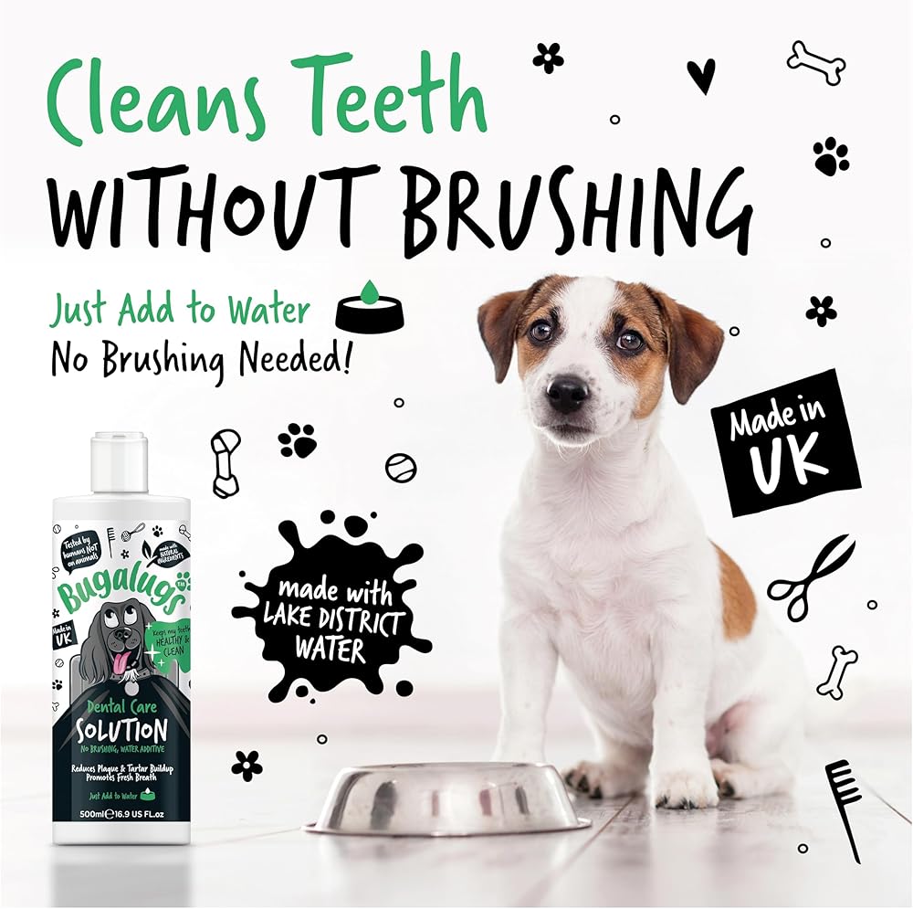 Freshen breath without the fuss - Bugalugs Dental Care Solution is made with natural ingredients that help to protect teeth and gums, reducing plaque & tartar build up, whilst promoting fresh breath. Simply add to your dog's water bowl - no toothpaste for dogs, toothbrush for dogs, or brushing needed!