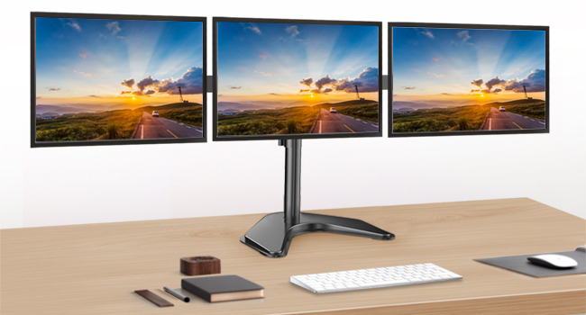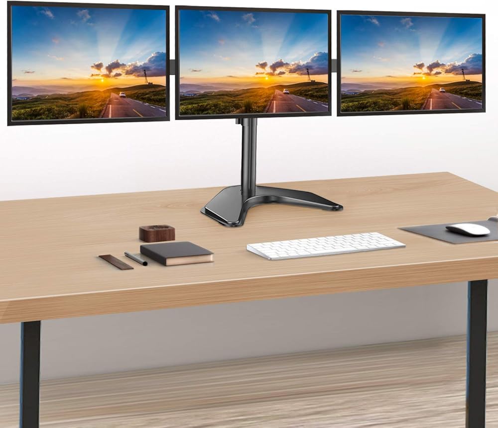 حامل شاشة ثلاثي HUANUO، حامل مكتب ثلاثي قائم بذاته للشاشات حتى 24 بوصة، ذراع شاشة عالي التحمل قابل للتعديل بالكامل، يحمل ما يصل إلى 22 رطلًا لكل منهما، VESA 75x75 أو 100x100