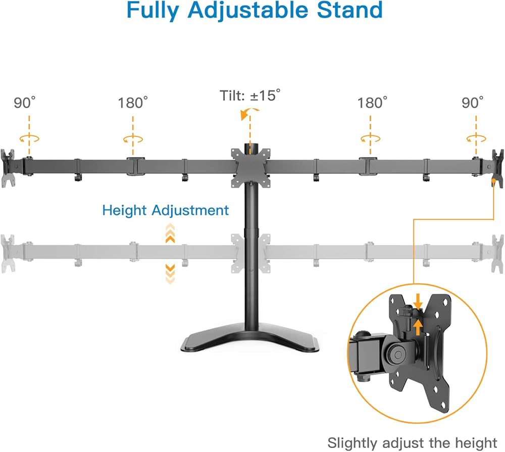 المفصلة وتعديل الارتفاع - ذراع قابل للتعديل بالكامل لحامل الشاشة الثلاثة هذا يوفر إمالة 180 درجة (يمكن للشاشة الوسطى أن تدعم فقط ±15 درجة إمالة بسبب مسند الظهر على العمود المركزي)، ودوران ±90 درجة، ودوران 360 درجة، و تعديل الارتفاع 16.7 بوصة على طول العمود المركزي. يمكن وضع الشاشات في الاتجاه الرأسي أو الأفقي