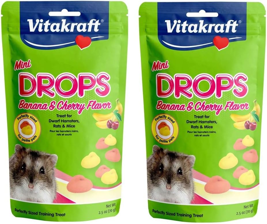 Delicious fruit flavored morsels made for the smallest of small pets. Treat your dwarf hamster, rat, or mouse to some well-deserved variety with Drops Mini: a new twist on our classic Vitakraft Drops treat featuring a tasty blend of banana and cherry flavored pieces.
