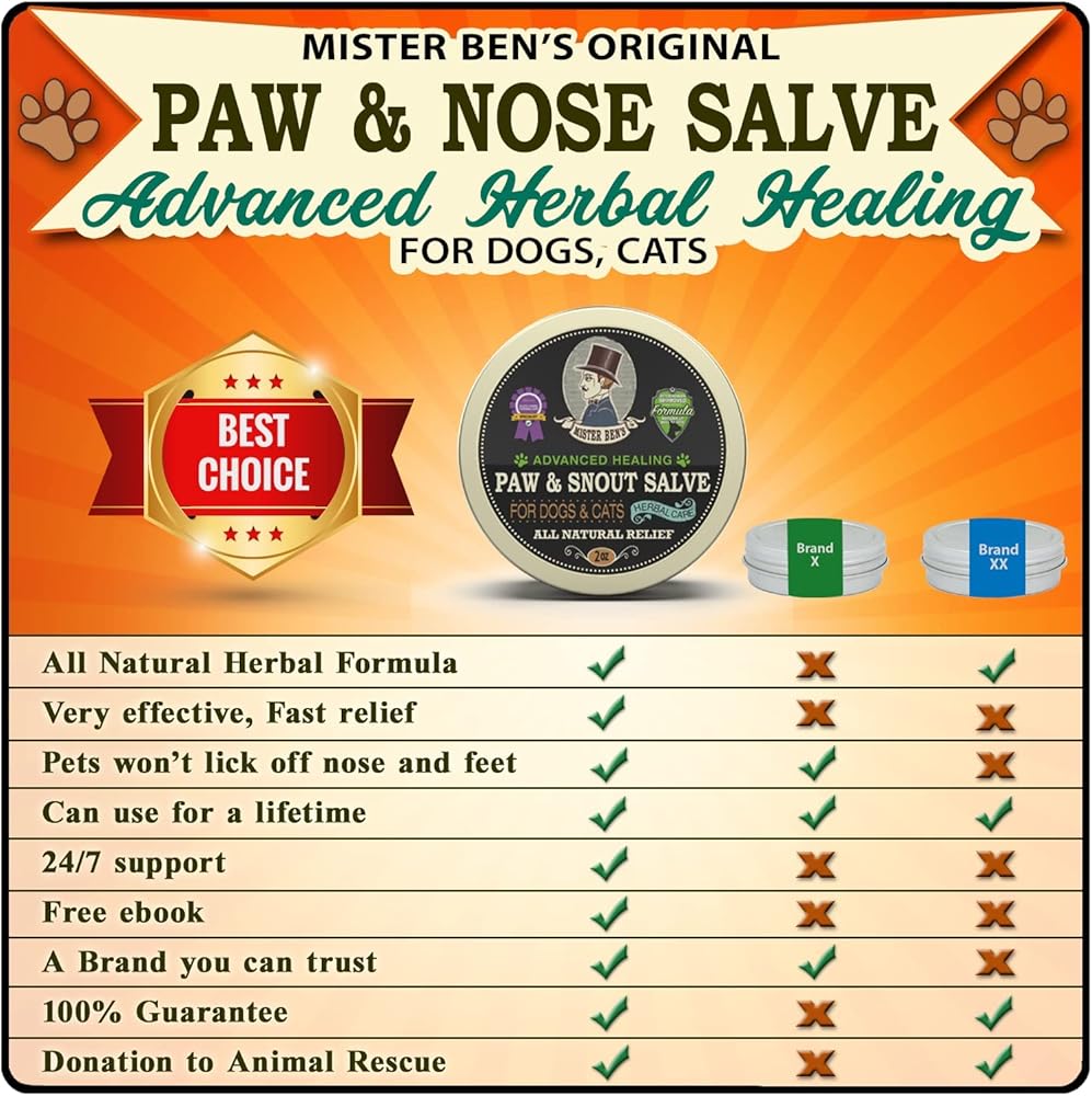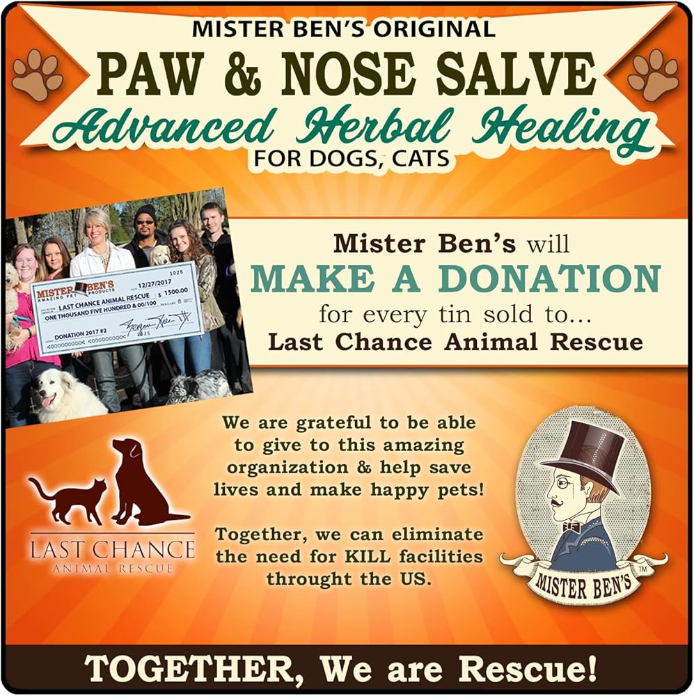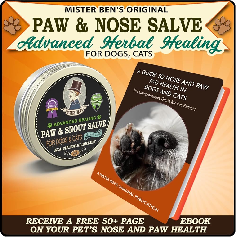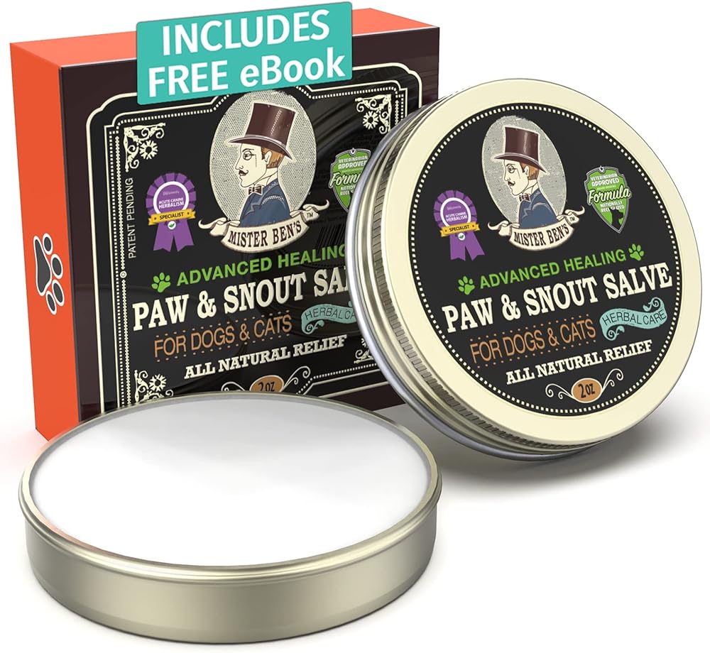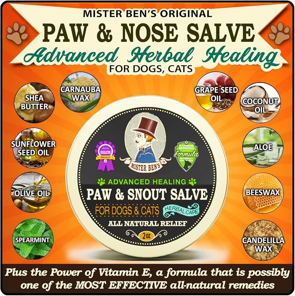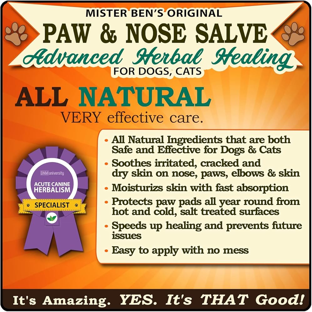 Mister Ben's Original Paw and Nose Herbal Salve and Balm (2 oz tin) is formulated for dogs and cats to relieve chapped, cracked paw pads and dry, rough noses. With all-natural moisturizers and effective herbal infusions. Mister Ben's provides unmatched results for your pet. Yes. It's THAT Amazing!