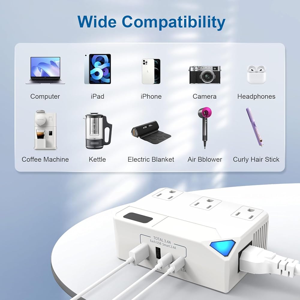 [طاقة عالية جدًا] تدعم طاقة الإخراج 2300 وات، لذلك يمكنك استخدام أي جهاز كهربائي عالي الطاقة، حتى سخان المياه. وهو يدعم العديد من أنواع الأجهزة المختلفة، بما في ذلك الهواتف المحمولة وأجهزة الكمبيوتر المحمولة والأجهزة اللوحية والكاميرات والغلايات والمصابيح المكتبية والشعر. مجففات، فرشاة أسنان كهربائية، شفرات حلاقة، مكواة تجعيد، غسالات صغيرة، والمزيد..