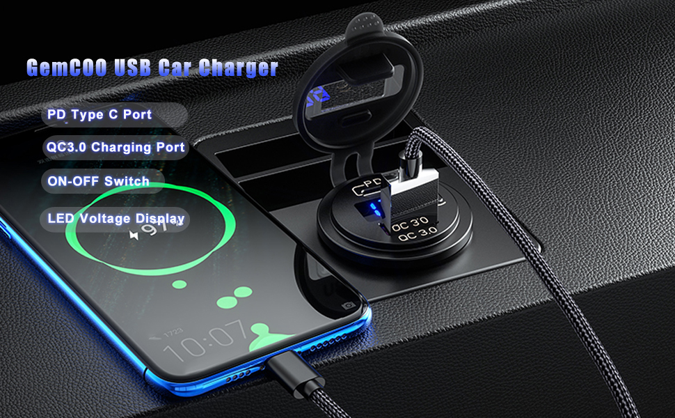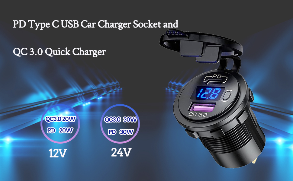 💜[منفذ سيارة USB من النوع C وQC3.0] -✨- توفر تقنية المقبس المقاوم للماء من النوع C الأكثر تقدمًا 2.0 شحنًا سريعًا للغاية لأجهزة USB-C، بينما توفر تقنية Qualcomm Quick Charge 3.0 سرعة شحن وهي أسرع بما يصل إلى 4 مرات من الشحن التقليدي، ويتم الشحن بسرعة مضاعفة مثل Quick Charge 1.0 وأكثر كفاءة بنسبة 38% من QC 2.0.