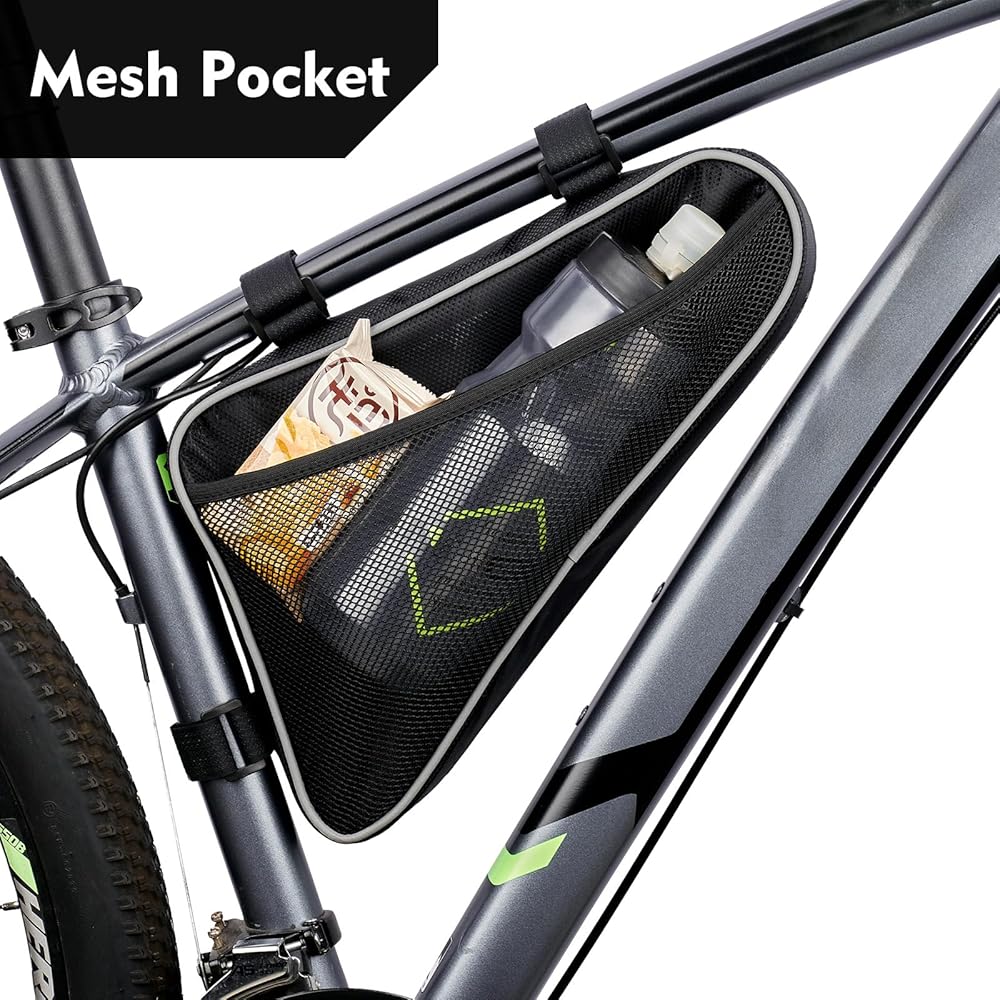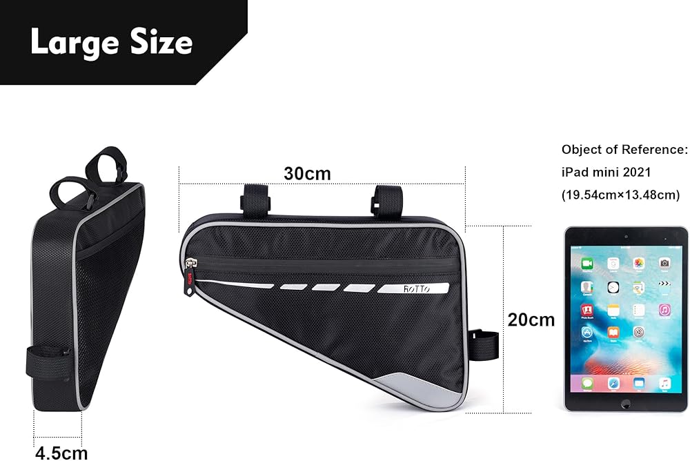 • سعة كبيرة (2 لتر): تتميز حقيبة الإطار المثلث للدراجة هذه بسعة كبيرة جدًا تصل إلى 2 لتر، الحد الأقصى للحجم هو 11.8 بوصة × 8.3 بوصة × 2.1 بوصة، والوزن 6.3 أونصة فقط.