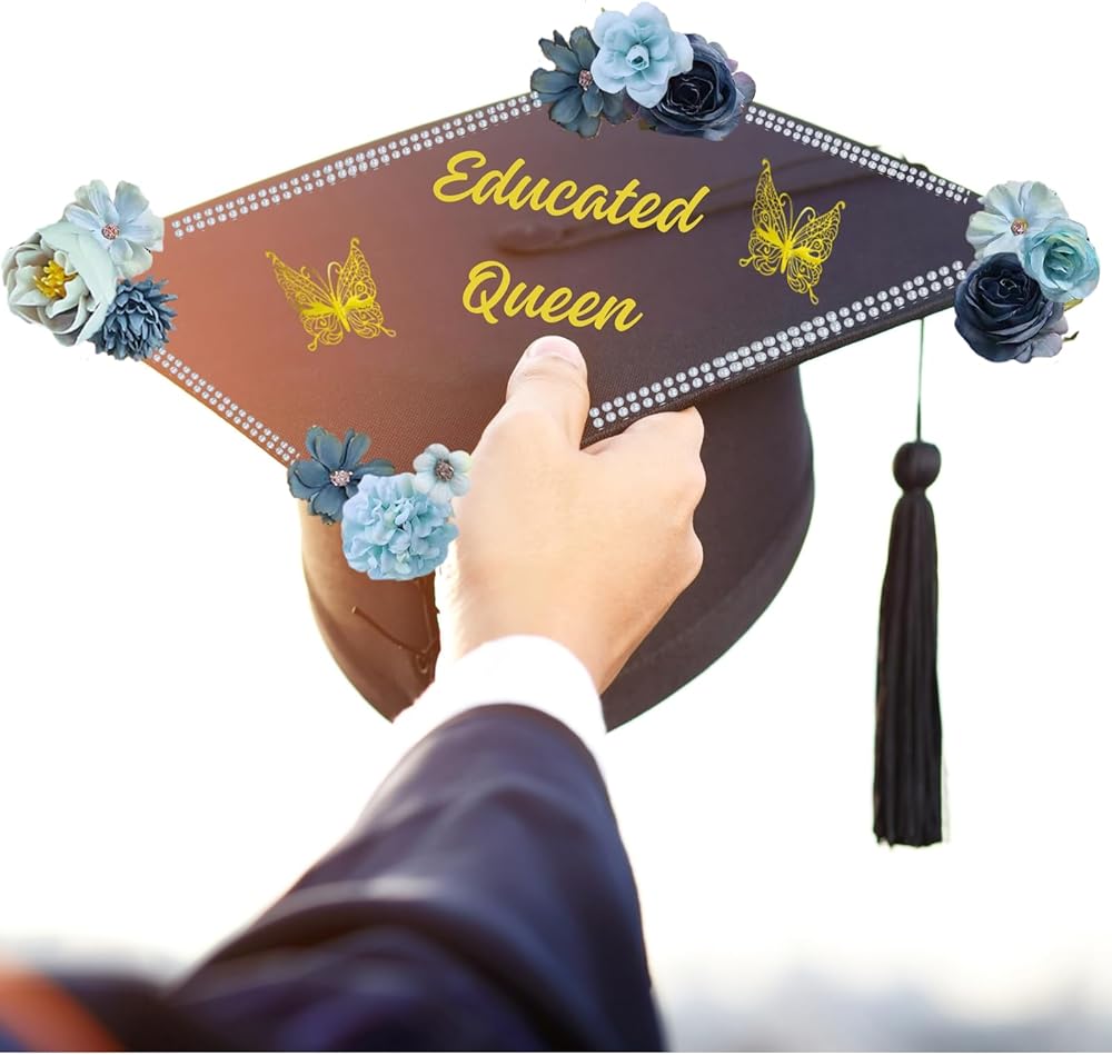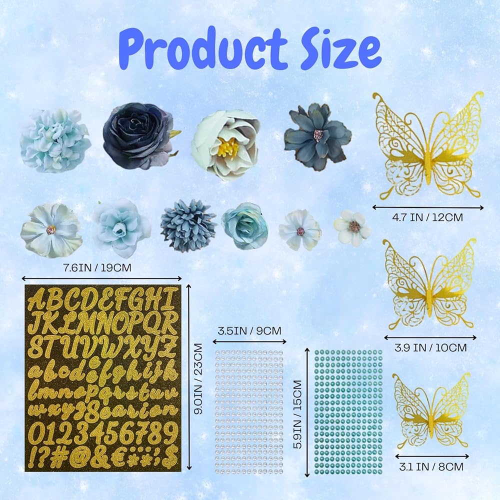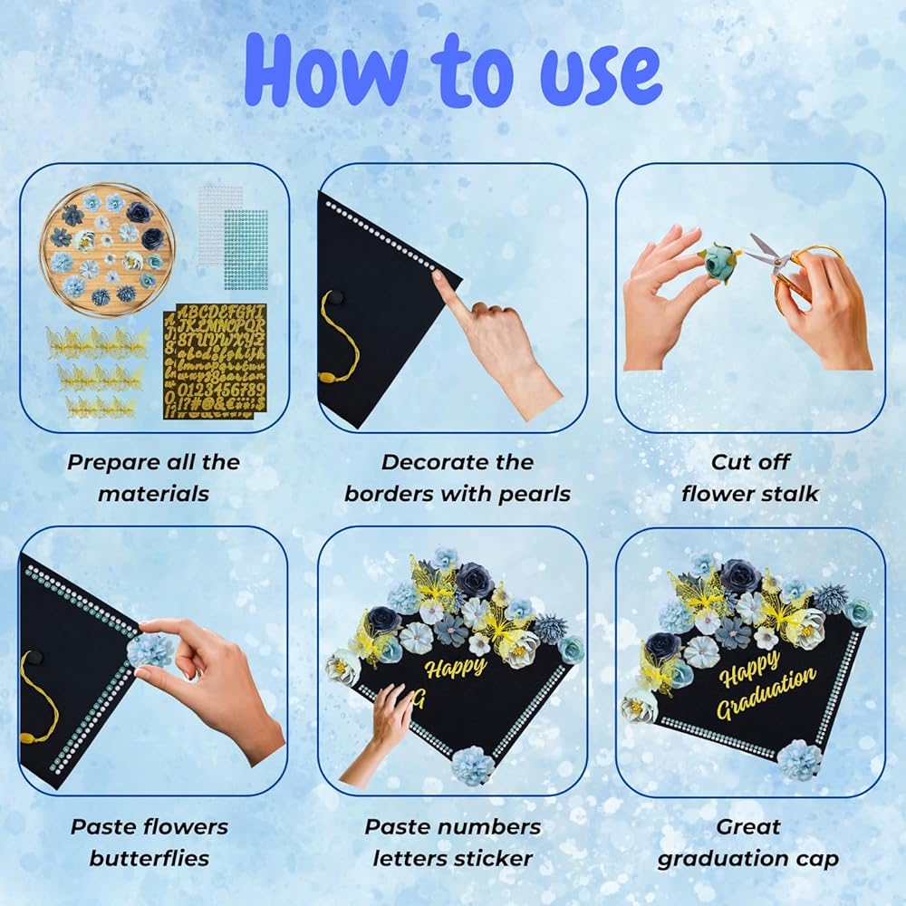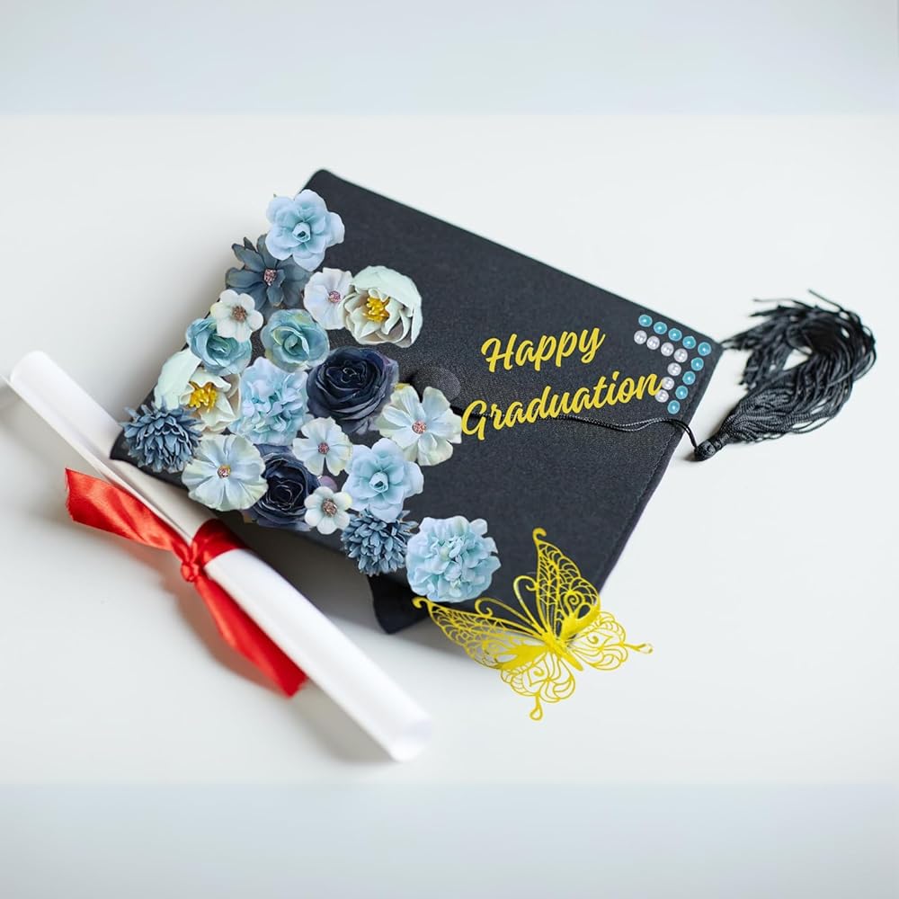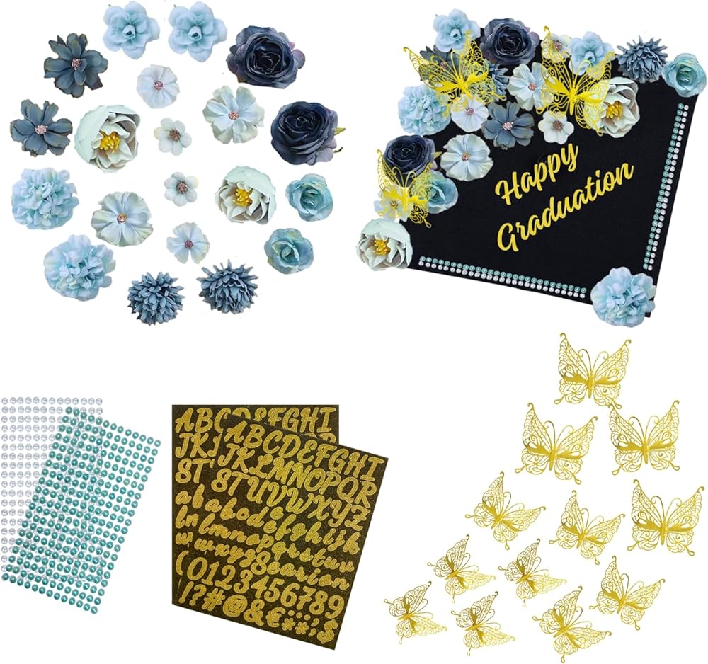 مجموعة تزيين قبعة التخرج: سوف تحصل على مجموعة من مجموعة إكسسوارات قبعة التخرج التي يمكنك صنعها بنفسك، بما في ذلك مجموعة واحدة من الزهور الاصطناعية، و12 قطعة من الفراشات ثلاثية الأبعاد، و2 ورقة من ملصقات أرقام الحروف الذهبية اللامعة، و2 ورقة من ملصقات اللؤلؤ، و6 أوراق من نقاط الصمغ، كمية كافية لتلبية احتياجات ديكور قبعة التخرج الزرقاء.