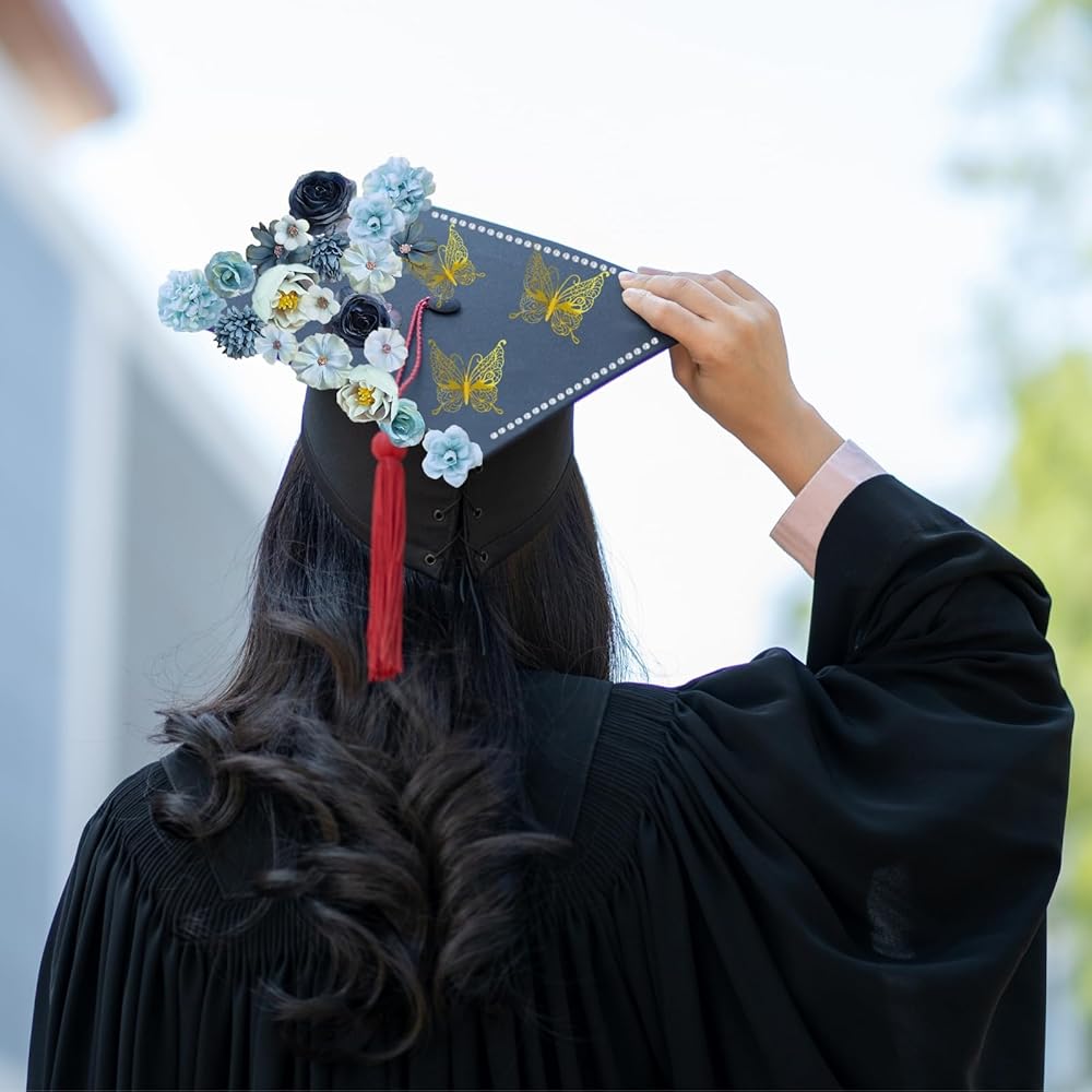 متعة الأعمال اليدوية: أولاً، يمكنك استخدام نقاط الغراء للصق زهور متنوعة. ثانيًا، يمكنك استخدام الحروف الأبجدية لتهجئة الأسماء أو كلمات البركات، ومن ثم تزيينها باللؤلؤ والفراشة ثلاثية الأبعاد. وأخيرًا ستحصل على قبعة أكاديمية زرقاء فريدة وملفتة للنظر. استمتع بعملية صنع قبعة التخرج بنفسك.