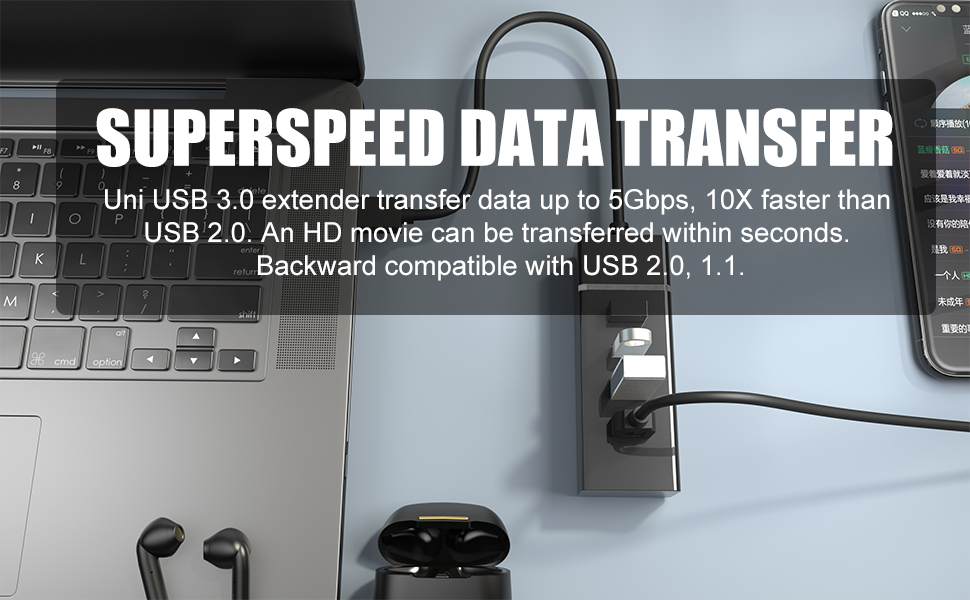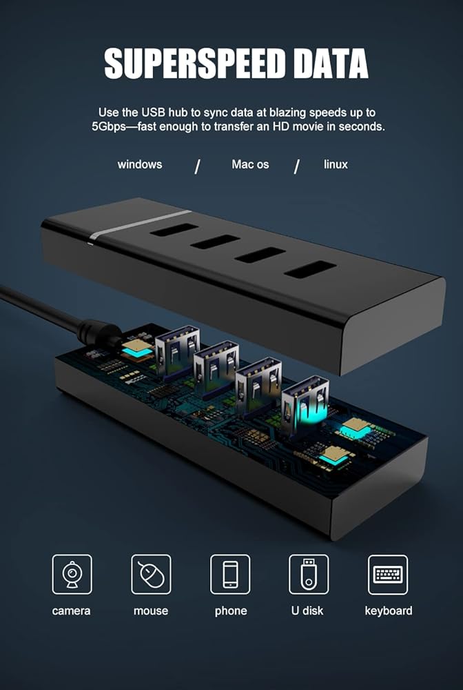 【سرعة نقل البيانات 5 جيجابايت في الثانية】: يقوم محور USB 3.0 هذا بمزامنة البيانات بسرعات فائقة تصل إلى 5 جيجابايت في الثانية، وهو أسرع بأكثر من 10 مرات من USB 2.0، سريع بما يكفي لنقل فيلم عالي الدقة في ثوانٍ. ملاحظة: لا يدعم موزع USB هذا الشحن.