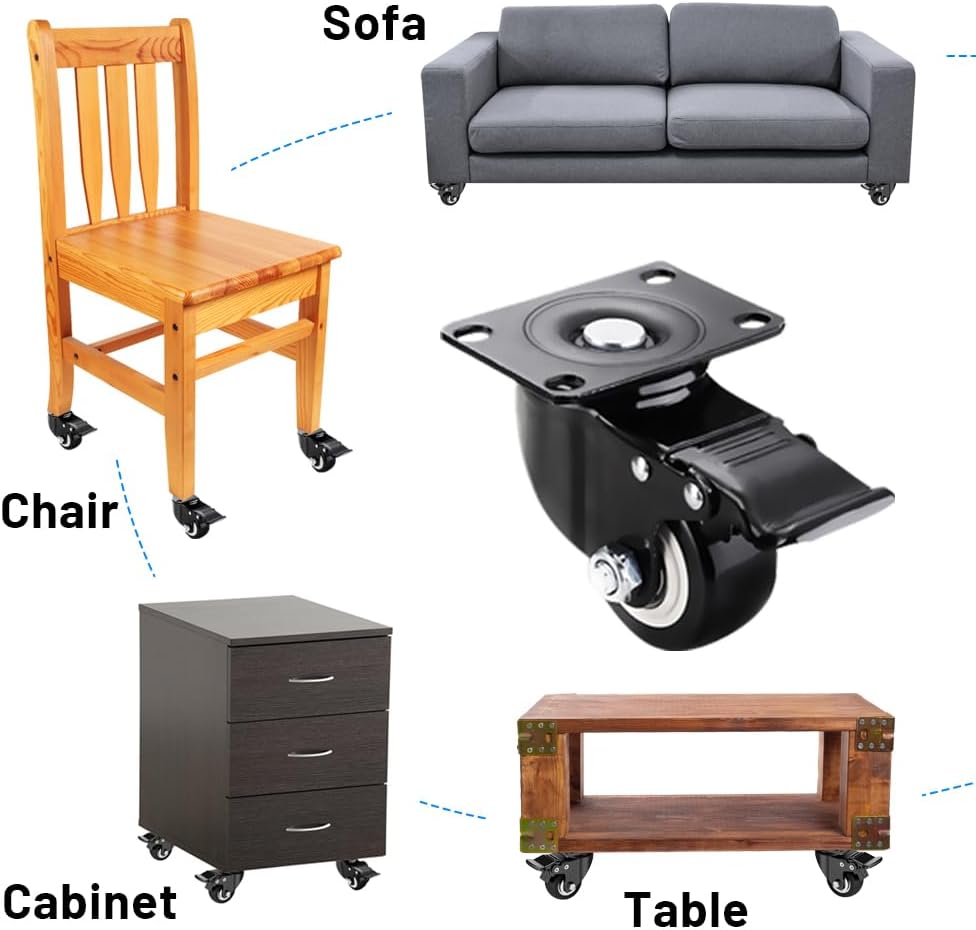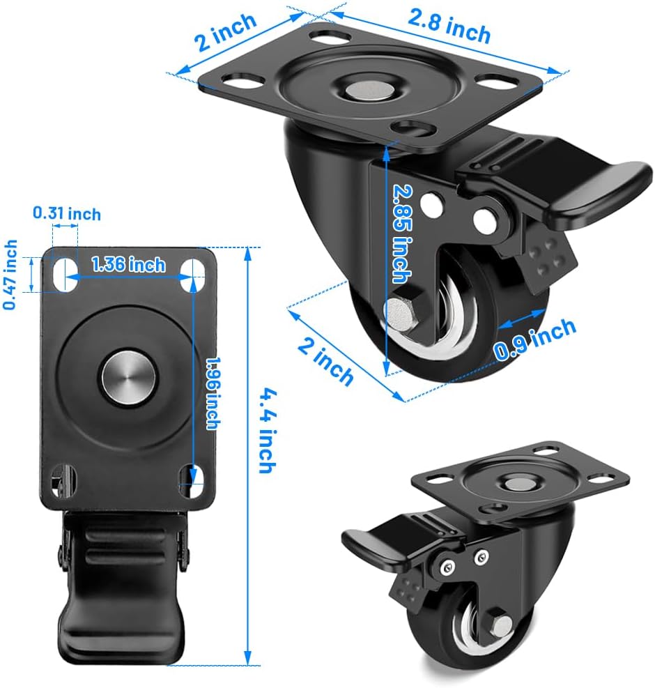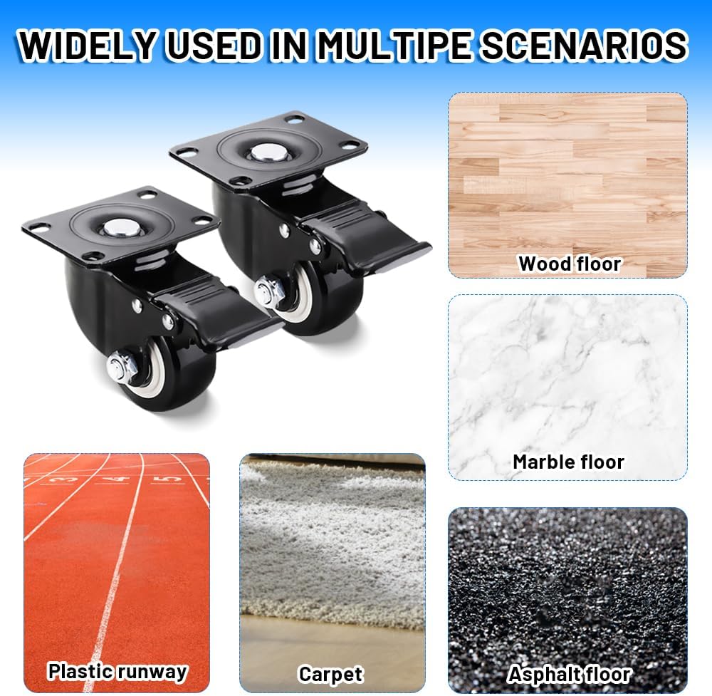 استخدام واسع وسهل التجميع: يمكن استخدام العجلات مقاس 2 بوصة لكل من المعدات الداخلية والخارجية. يمكنك استخدامها لعربة التسوق، والأثاث، ومنضدة العمل، وصناديق الأدوات، والمرفقات الكهربائية، ومكبرات الصوت، والعربة وما إلى ذلك. تأتي مع غسالات مقاومة للصدأ ومسامير تثبيت لسهولة التركيب