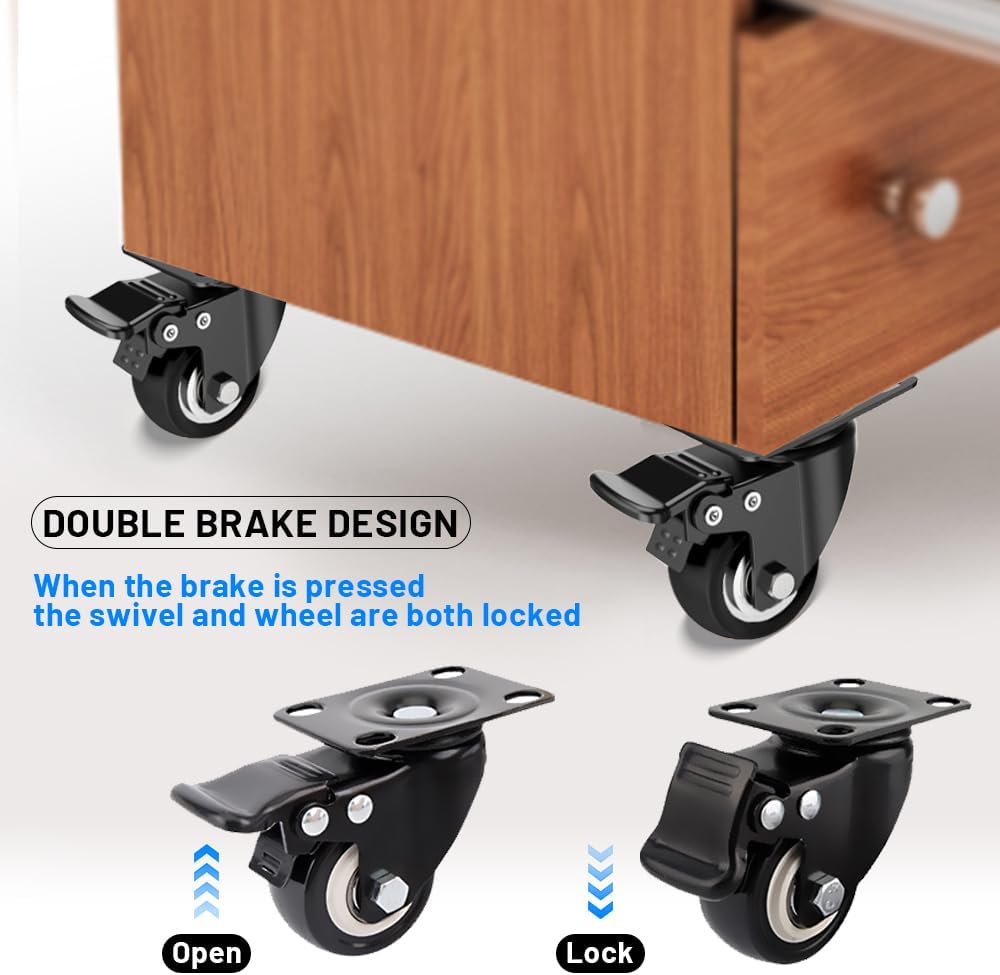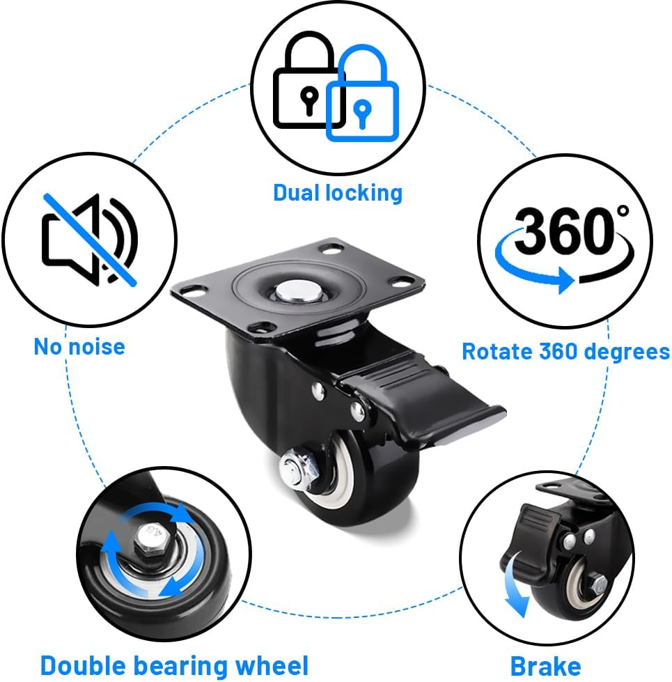 قفل مزدوج وأمان: تم تصميم العجلات الصناعية بآلية قفل مزدوجة. يمكنك بسهولة قفل العجلات والاتجاه للحفاظ على طاولة العمل في مكانها مع ثبات الفرامل