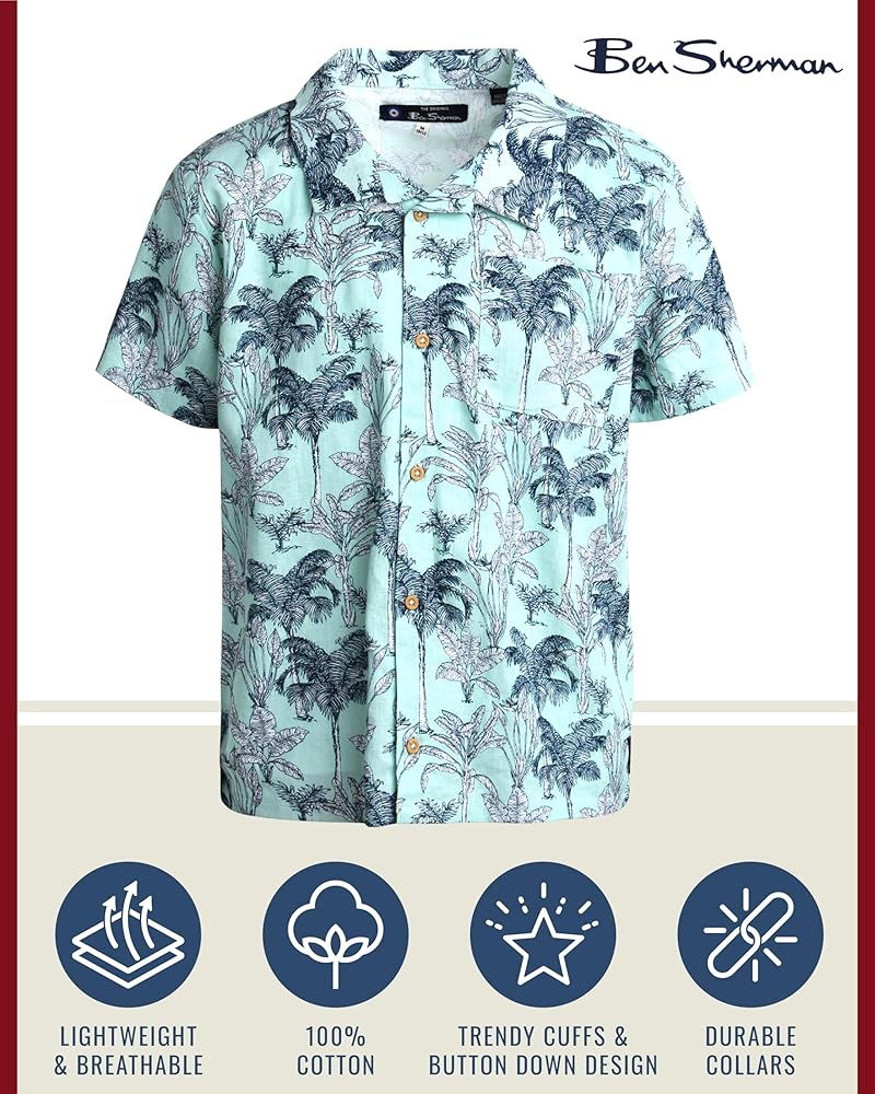 • OFFICIALLY LICENSED BEN SHERMAN: Boy's Linen Cabana Set with a Short Sleeve Button Down Collared T-Shirt and Matching Shorts; Embrace the new and different and reject the normal and mundane with Ben Sherman; Discover the best style as we aim to sharpen your wardrobe