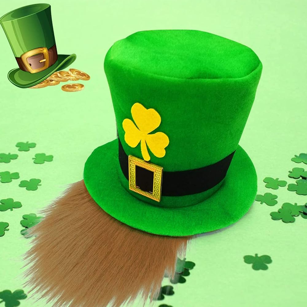 Leprechauns Hat with Brown Beards --- A must for a St. Patrick's Day party with of Shamrocks Green Hat and Beard. It's big and comfy and has a shamrocks above the brim--so you'll be a walking good luck charm! Features a built-in beard for a truly Irish getup. Also great for a Leprechauns costume, or just drinking whiskey at an Irish pub.