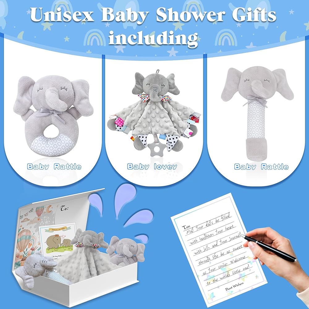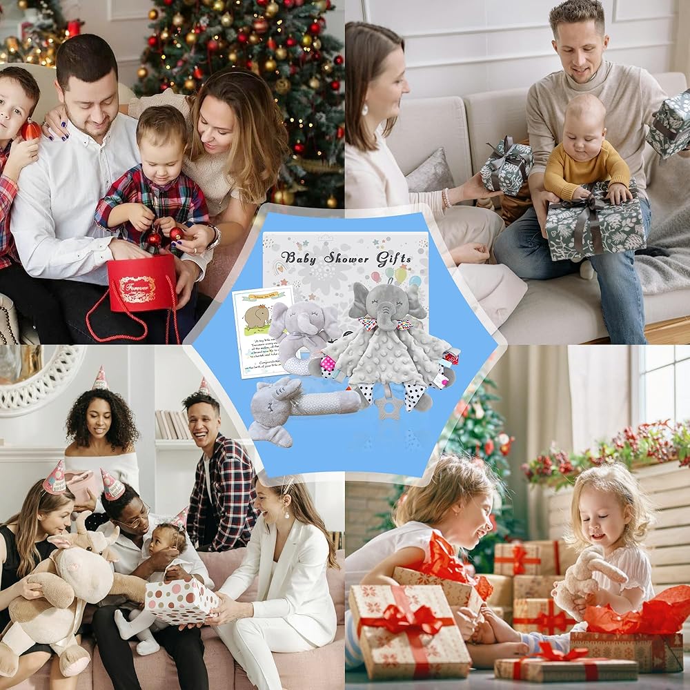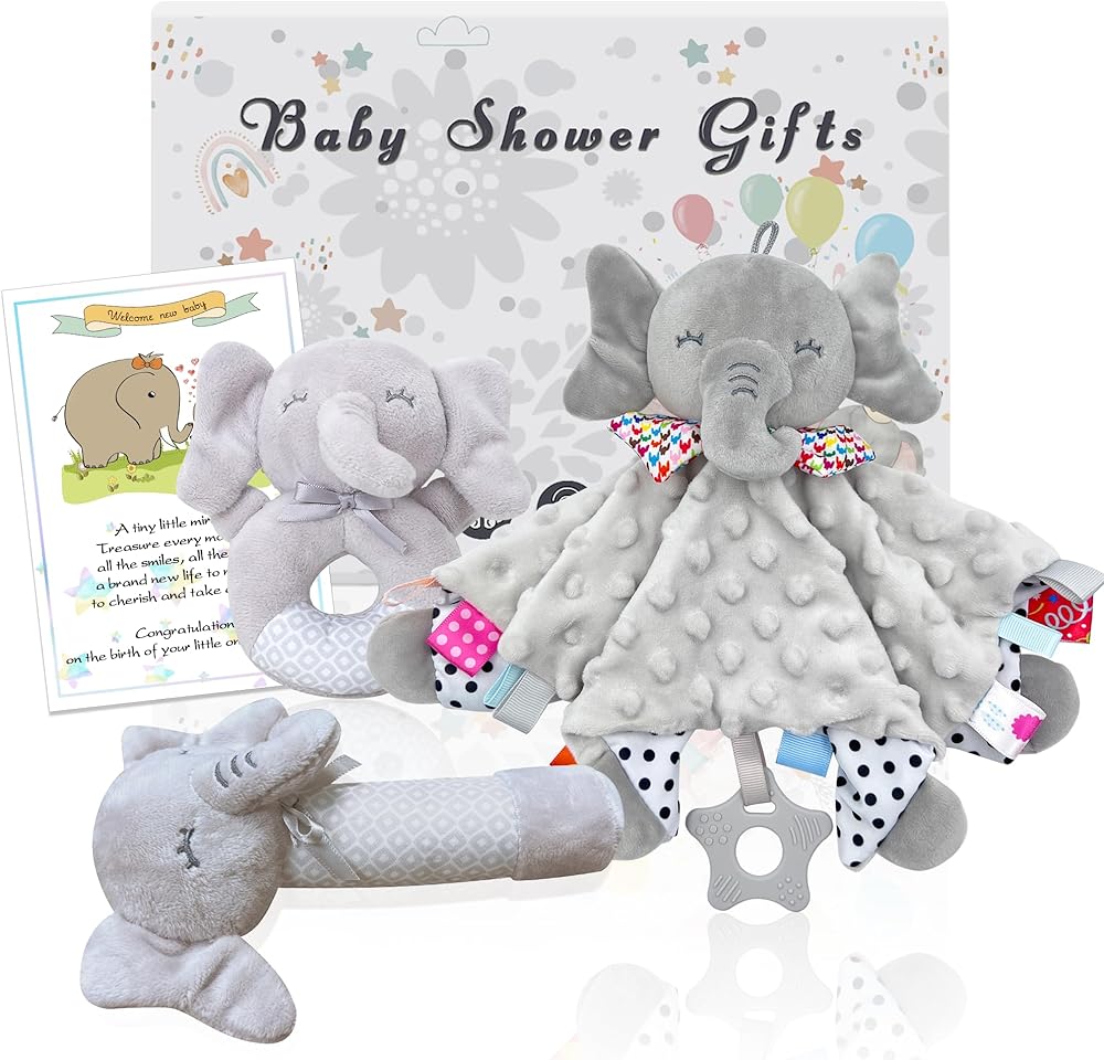 Thoughtful Baby Gift Basket - Packaged in a delightful gift box, our set includes 1 elephant security blanket, 2 elephant handbell grab shakers, and 1 greeting card, making it an ideal toy gift for baby showers, new parents, or any special occasion.