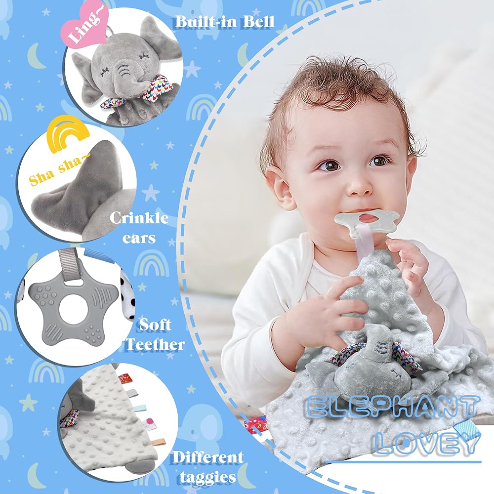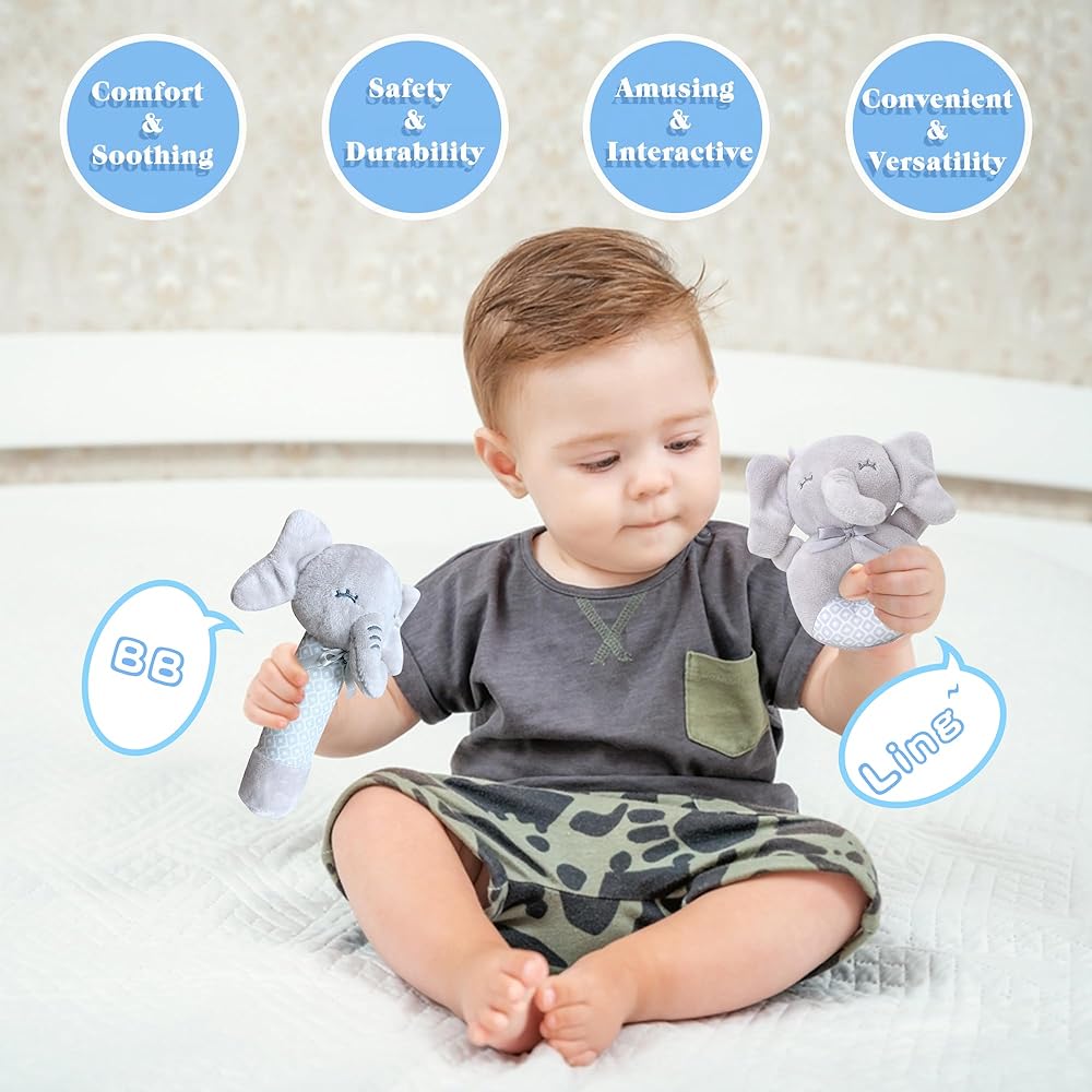Adorable Elephant Design - Each piece in the set showcases an adorable elephant motif, stimulating visual and tactile senses for your baby's development. This cozy elephant toy gift set will be a safe and secure long-lasting playmate for your little one!