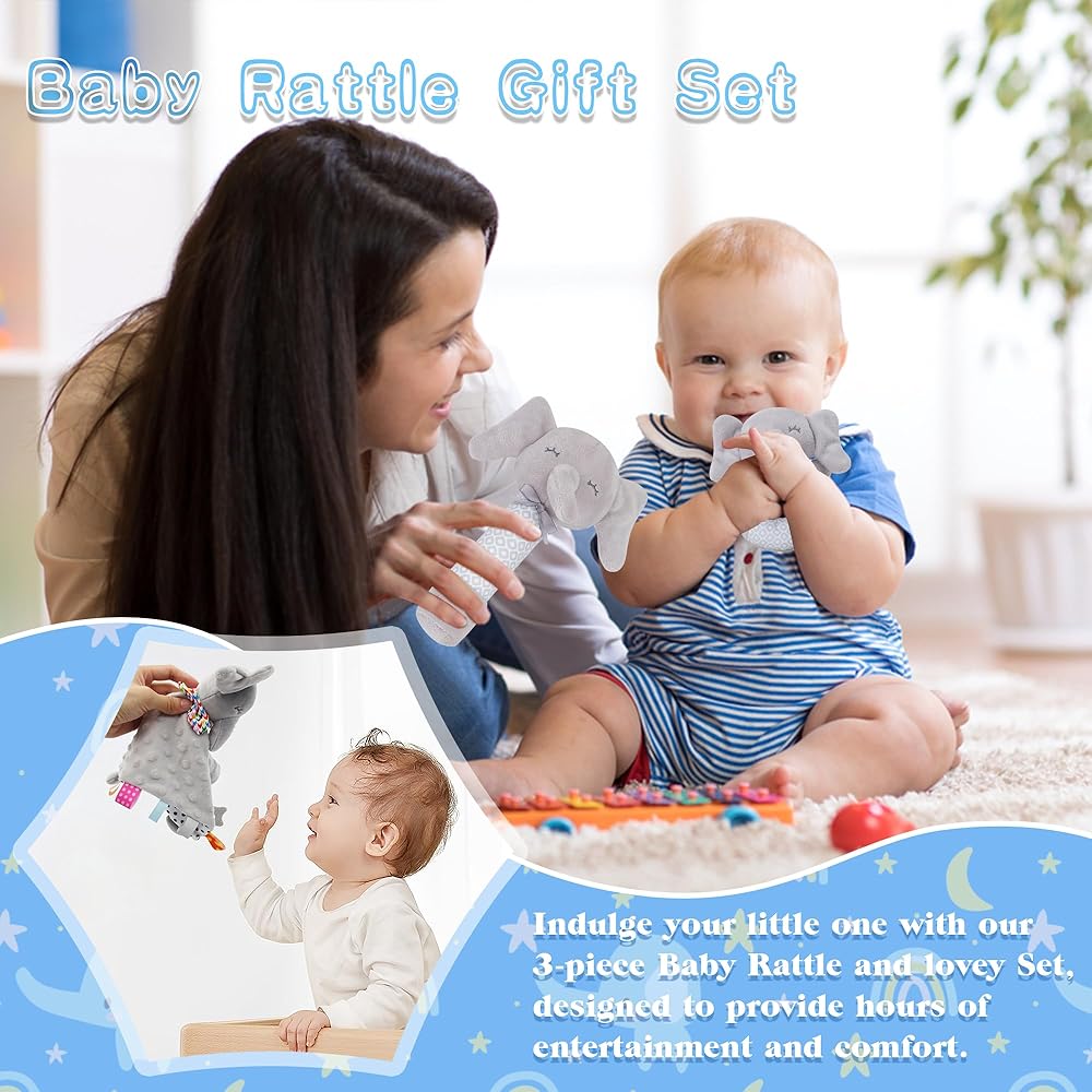 Indulge your little one with our 3-piece Baby Rattle and lovey Set, designed to provide hours of entertainment and comfort. Crafted with soft and durable materials, each piece features an adorable elephant design, sure to capture your baby's imagination. The rattles emit gentle sounds, promoting auditory development, while the security blanket offers tactile stimulation for tiny fingers. With reinforced seams, our set ensures safety during playtime, while the machine-washable fabric makes cleaning a breeze. Packaged in a charming gift box, this set makes a thoughtful present for baby showers, welcoming new arrivals with warmth and joy.
