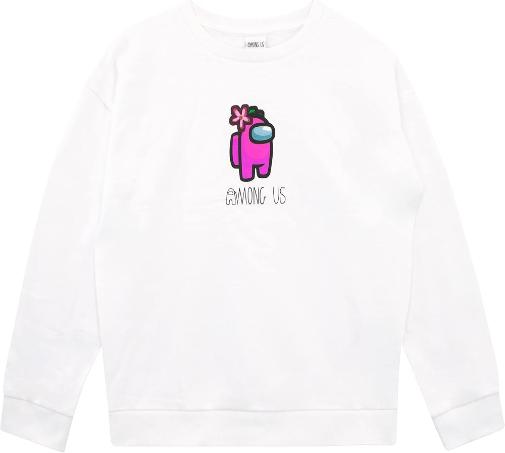 • Officially licensed Among Us merchandise. A white Among Us sweatshirt for kids, featuring a pink crewmate