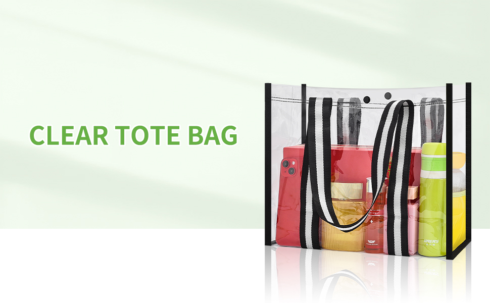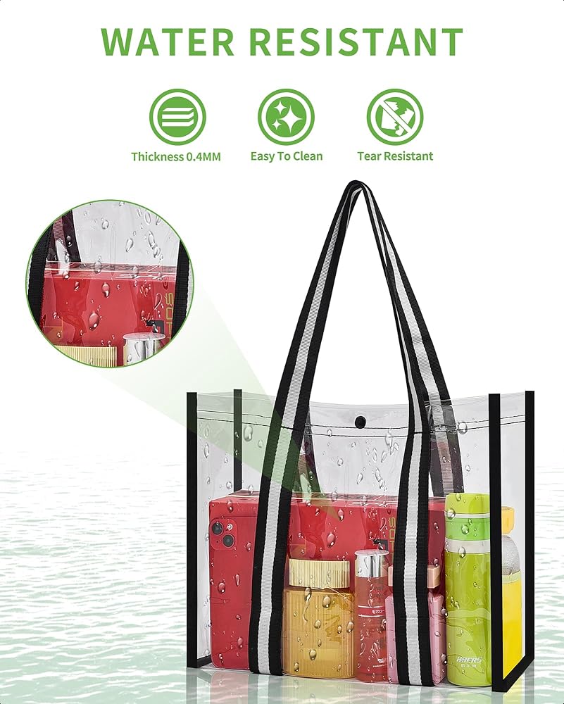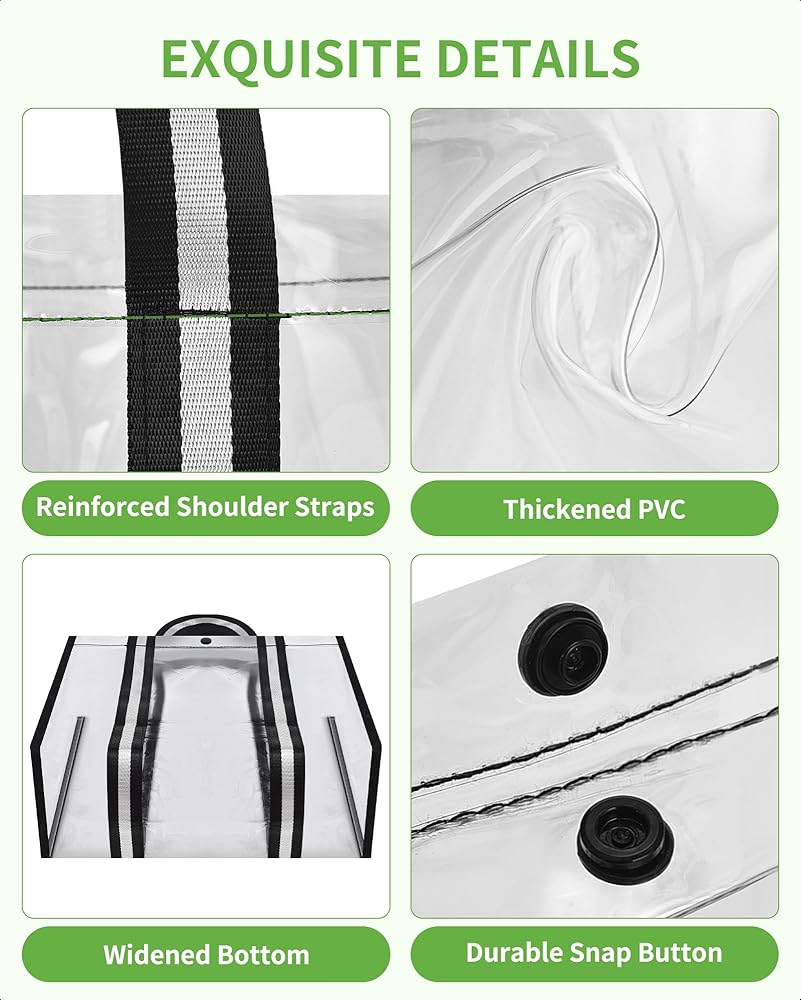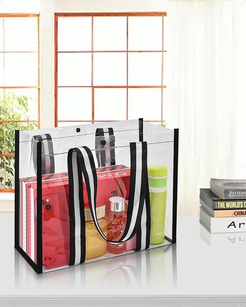 - 【مادة تدوم طويلاً】حقيبة اليد الشفافة هذه مصنوعة من مادة PVC المقاومة للماء بسمك 0.4 مم ولها مقابض من النايلون المقوى بخياطة مزدوجة.