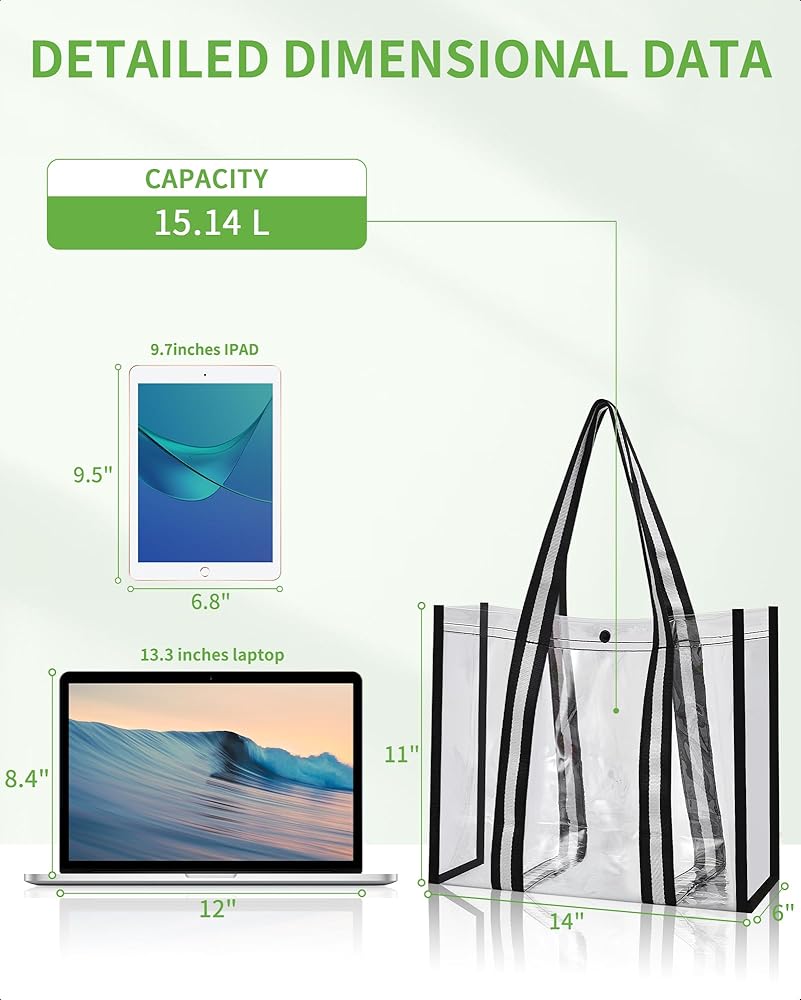 - 【سعة كبيرة】قياس الحقيبة الشفافة هو 35.56 سم × 15.24 سم × 27.94 سم - كبيرة بما يكفي لحمل كاميرا رقمية، وكمبيوتر محمول مقاس 13.3 بوصة، وغسول تسمير البشرة، وزجاجة مياه، ومحفظة، والهاتف الخلوي، والنظارات الشمسية، وما إلى ذلك.