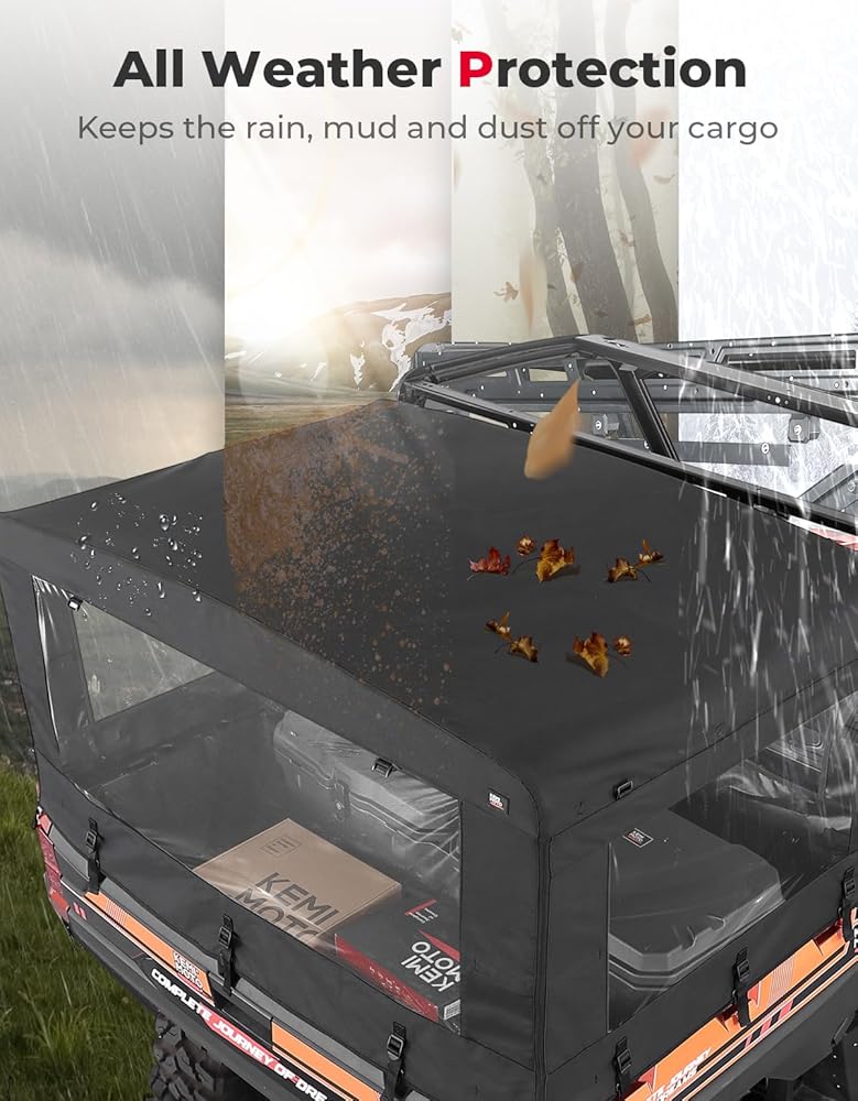• 【قوي متين ومقاوم للماء】 غطاء سرير البضائع KEMIMOTO UTV مصنوع من إطار فولاذي مع أقواس دعم أنبوبية. قماش أكسفورد مقاوم للماء 600D مع نوافذ شفافة. إنه يحمي بشكل فعال من الرياح والثلج والرمل والطين وفروع الأشجار، ويحجب المطر والأشعة فوق البنفسجية.