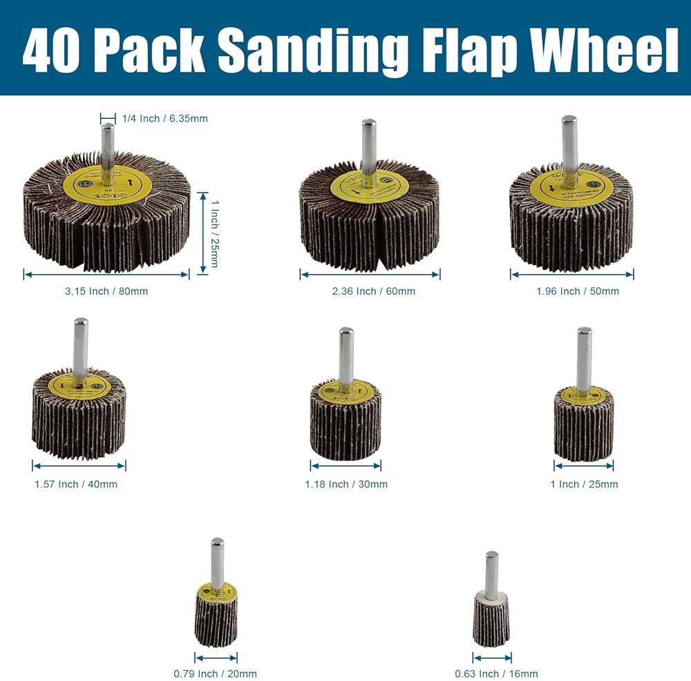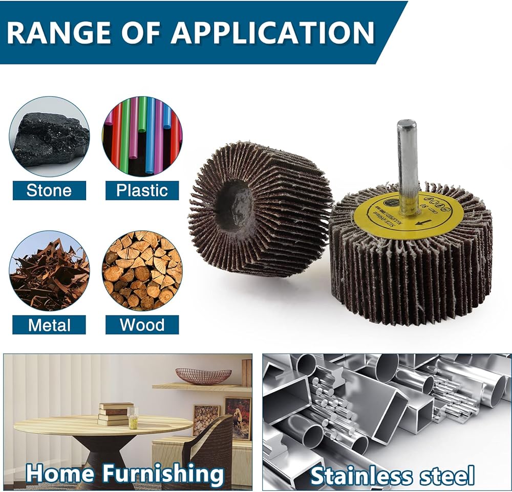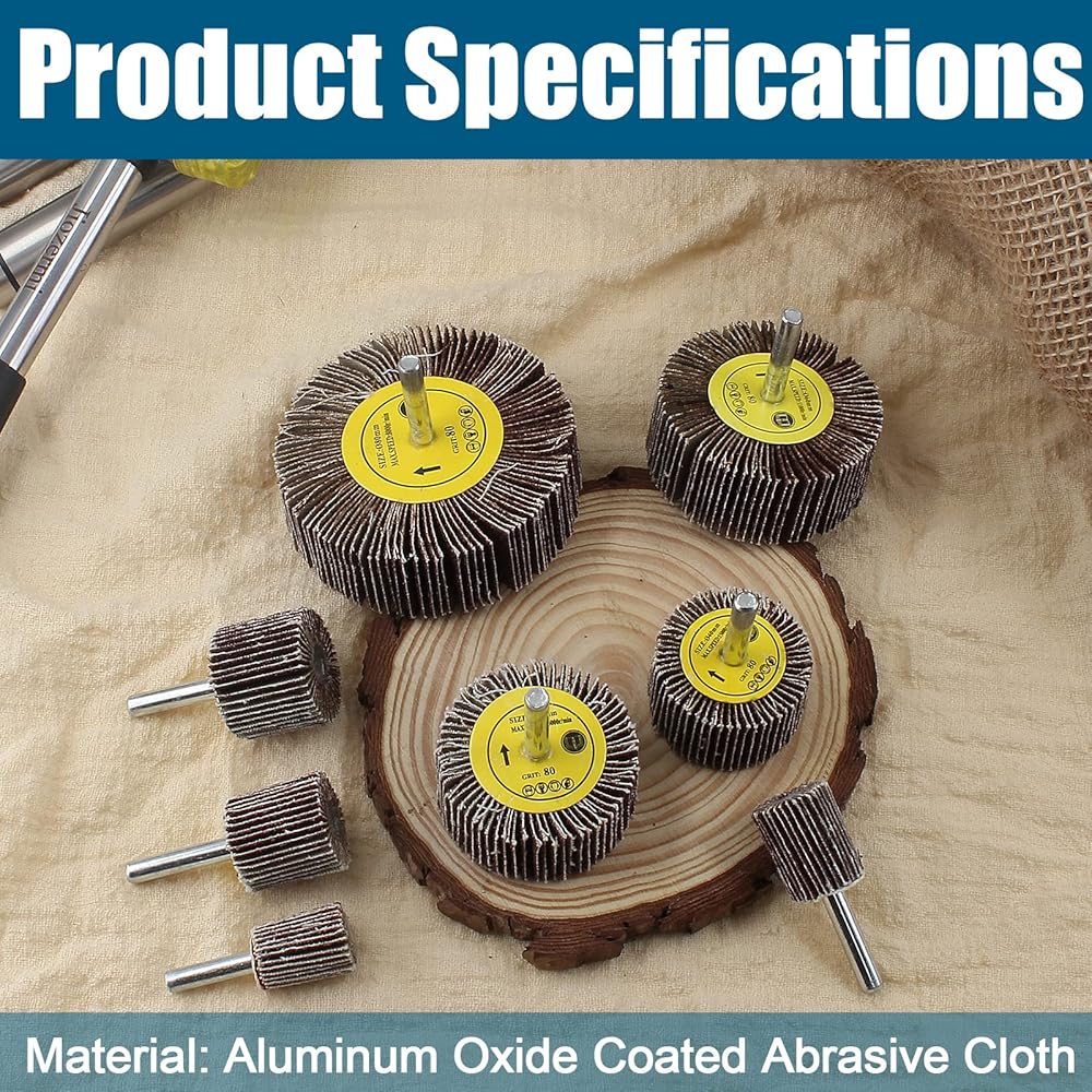A set contains 8 different sizes of abrasive flap wheels for flap sander wheels.