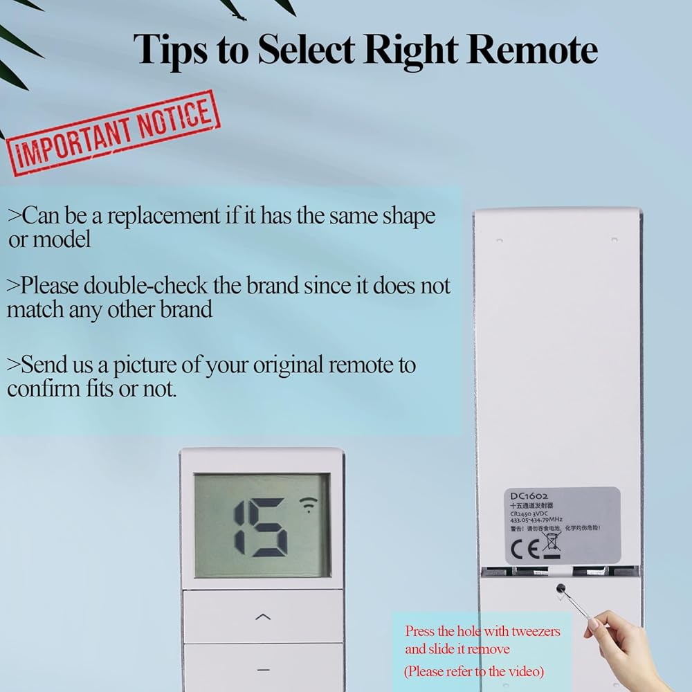 【Tips to Select Right Remote】①The model dc1602 remote can be a replacement for your existing remote if it has the same shape or model. ②Please note that it is not compatible with any other brand, please double-check the brand before placing your order to ensure compatibility.