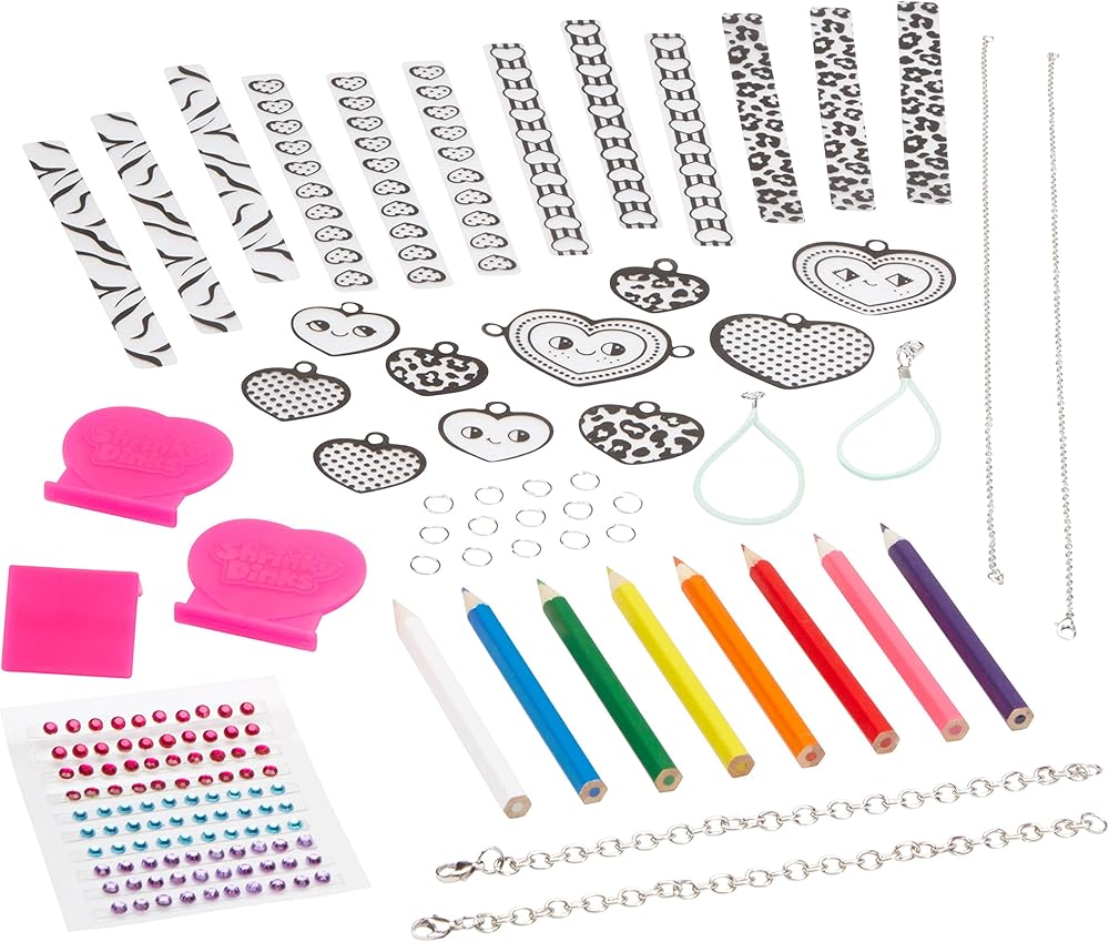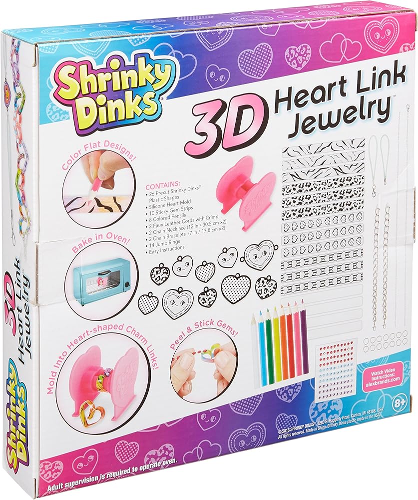 Shrinky Dinks 3D heart link jewelry kit is a new way to shrink and link! bake and mold custom 3D hearts that you link together to make jewelry! customize your pre-cut, pre-printed Shrinky Dinks pieces with your favorite colors, then place in the mold and shrink. Make heart shaped charms and heart shaped links that can be finished with sticky gems and jewelry findings. Includes 26 pre-cut Shrinky Dinks, silicone heart mold, 10 sticky gem strips, 8 colored pencils, 2 faux leather cords with crimp, 2 chain necklaces (12in./30.5cm. Each), 2 chain bracelets (7in./17.8cm), 14 jump rings and easy instructions. Recommended for children 8 years of age and older.