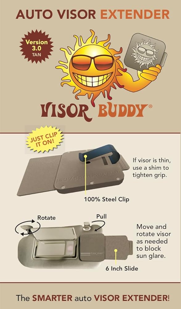 Introducing Visor Buddy Original Edition 3.0 - Your Visor Gap Solution! Tired of visor gaps letting in unwanted sun glare while you are driving? Visor Buddy 3.0, available in new Black color or in Tan as well, seamlessly blocks those visor gaps wherever they appear. ✨ Features: - Lightweight, under 6 oz. - No-fuss maneuvering (no velcro needed) - Secured with a firm steel clip - Two Editions: natural tan color and a NEW sleek black edition  - Extendable slide offers up to 6 inches of coverage 📐 Specs: - Weight: 5.5 oz - Dimensions: 7.5” x  4”x 0.5” inches - Tan or Black color choice complements any interior - Crafted from automotive-grade plastic - Reinforced with 6 metal screws - Strong steel clip ensures durability 🚗 Built for Your Safety: We prioritize blocking dangerous sun glare for safer driving. Visor Buddy, available in Black or Tan editions, is designed to enhance safety and reduce accident risks. 🛠️ Solid Construction: Visor Buddy is built to last, crafted with durability in mind to serve you for years of use. Upgrade to Visor Buddy Original Edition 3.0 - the reliable solution engineered to plug side visor gaps, ensuring safer drives and lasting reliability for your peace of mind! —Easy Installation: Installing Visor Buddy is a breeze. Simply attach it to your car's sun visor using the strong steel clip provided. No tools or complicated instructions required. Within seconds, you'll have added an extra layer of protection to your driving experience. - Versatile Design: Whether you have a compact car or a spacious SUV, Visor Buddy is designed to fit all vehicle types. Its dimensions of 7.5" x 4" x 0.5" inches make it the perfect size to seamlessly blend into any interior. Plus, with the option to choose between tan or black, you can select the color that best complements your car's aesthetic. - Enhanced Visibility: Say goodbye to annoying sun glare that hinders your vision on the road. Visor Buddy's automotive-grade plastic is specifically engineered to block out harmful rays, ensuring clear visibility at all times. With this added protection, you can drive with confidence, knowing that your safety is our top priority. - Unmatched Durability: We understand that your car accessories need to withstand the test of time. That's why Visor Buddy is reinforced with six metal screws, providing extra strength and stability. No matter how bumpy the road gets, this visor will stay securely in place, offering you long-lasting reliability. In conclusion, Visor Buddy is the ultimate solution for safer and more comfortable driving. Its easy installation, versatile design, enhanced visibility, and unmatched durability make it a must-have accessory for every car owner. Upgrade to Visor Buddy 3.0 for added protection and enjoy worry-free journeys on the road.