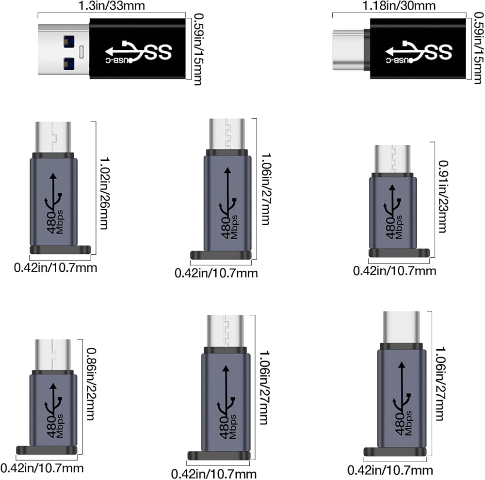 8 TYPES OF ADAPTERS: 8 adapters with different transfer interfaces, including USB C/Micro USB to Mini USB connector, Micro USB to USB C extender, USB female to TYPE-C male, TYPE-C female to USB male charging converter, enough quantities for you to choose from to fit any model and meet all your needs.