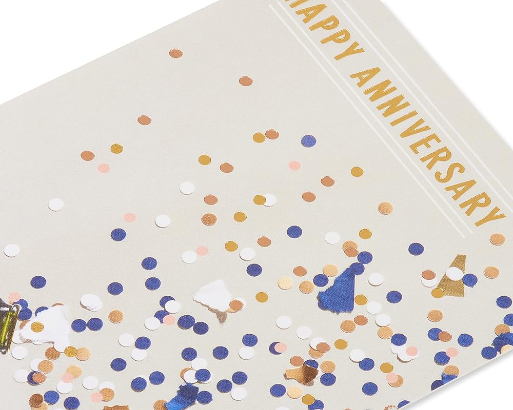 • Celebrate a special pair with a Happy Anniversary card. Anniversary card for a couple features a romantic damask pattern embellished with sparkling glitter, gold foil and a gauze ribbon attachment. With its lovely message and beautiful design, it is the perfect anniversary card to give.