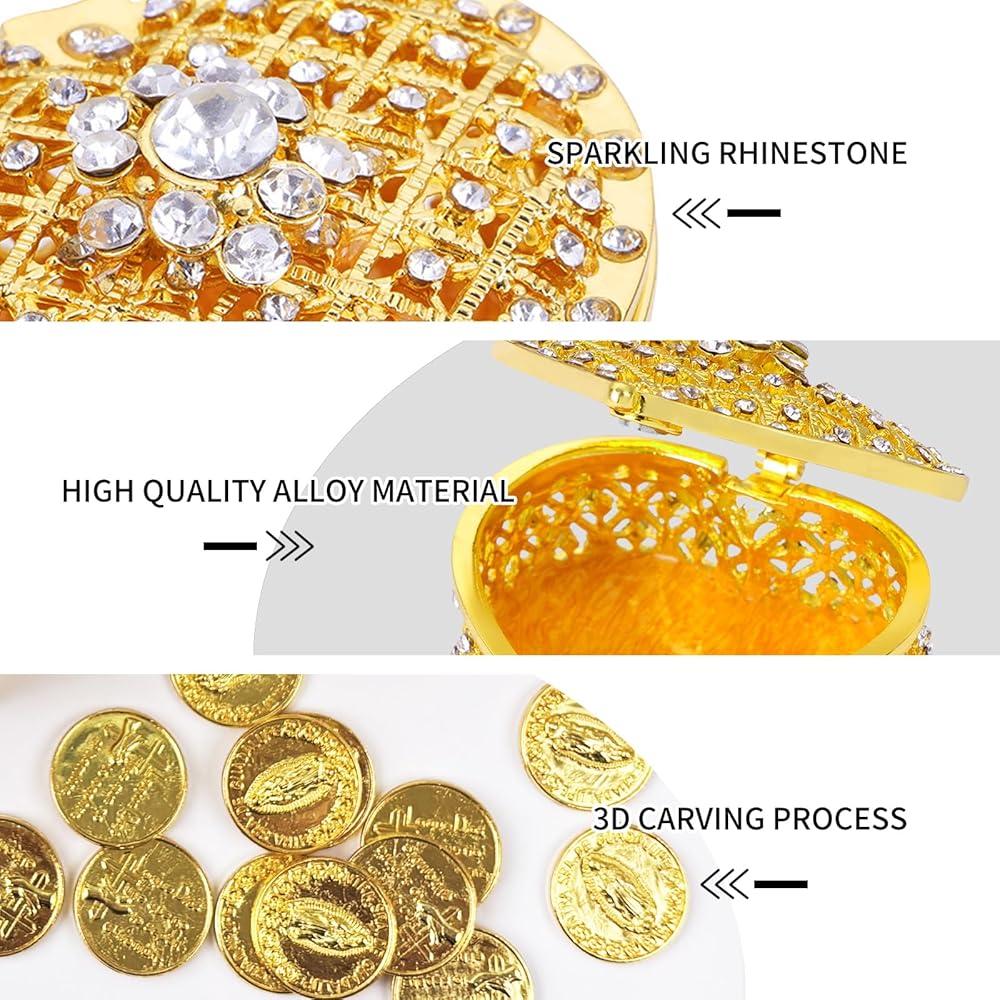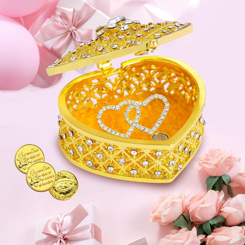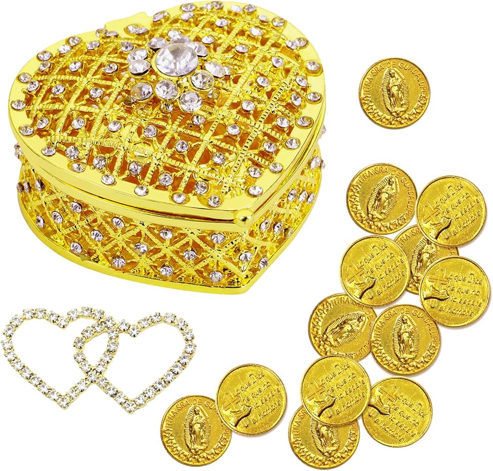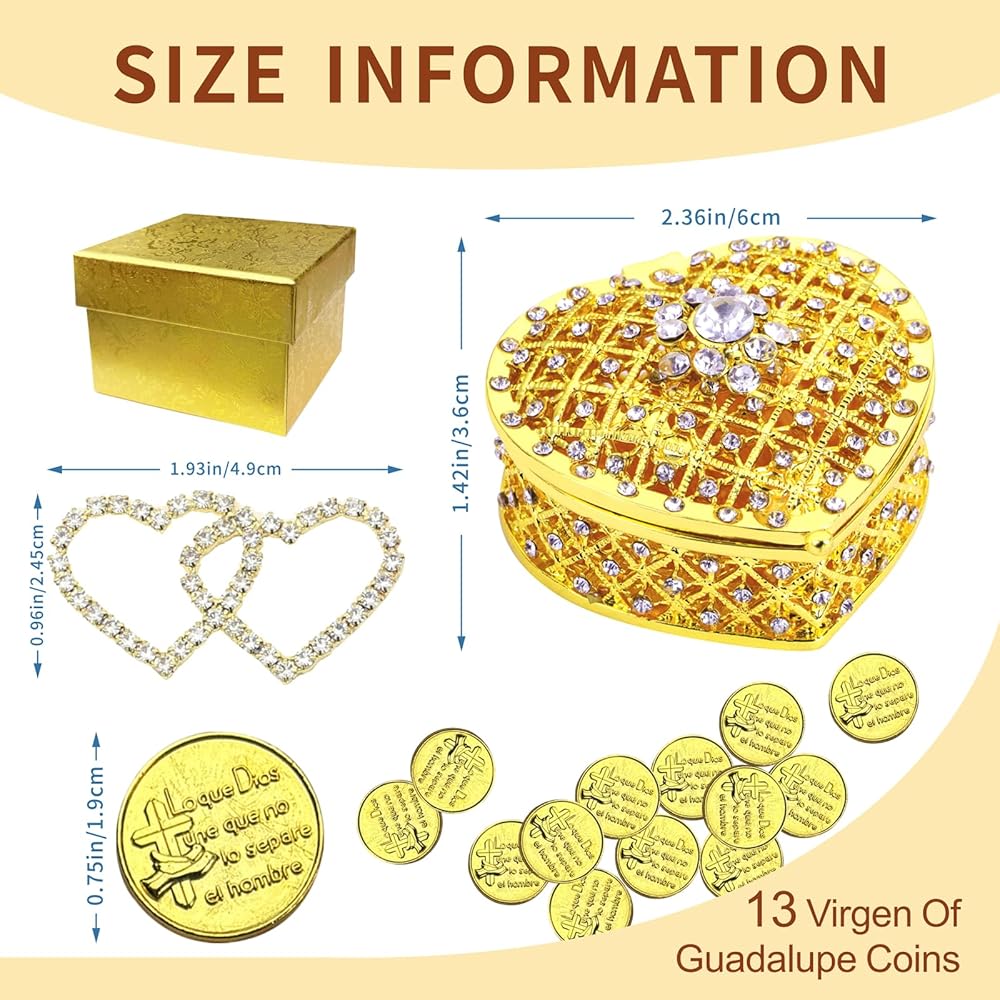 【Wedding Coins Set】:The lazo para boda catolica set includes a stunning gold heart-shaped metal box adorned with sparkling diamonds adding a touch of glamour and elegance to your special day.The 13 elegant gold Virgen of Guadalupe coins embody the joining of two lives into one.To further enhance the ceremony, the set includes a double heart accessory, reflecting the couple's boundless love for each other.